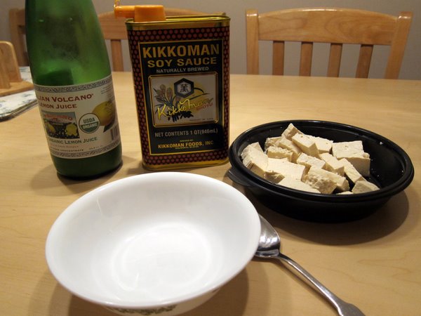 3. Pour the sauce over the tofu, taking care to coat each piece. Let it sit for awhile to marinade. Five minutes or so should be plenty of time.