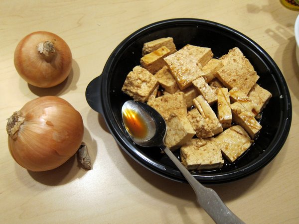 Duh. Tofu is the solution to my bistek problem. However, I still have issues with tofu texture and taste. There is just no getting away from that tofu taste. Anyway, I had leftover tofu in the fridge and decided to try making it into Tofustek! (exclamation point is required). I am 99% happy with the result. It still needs something, but here is the basic recipe with which we can tinker.