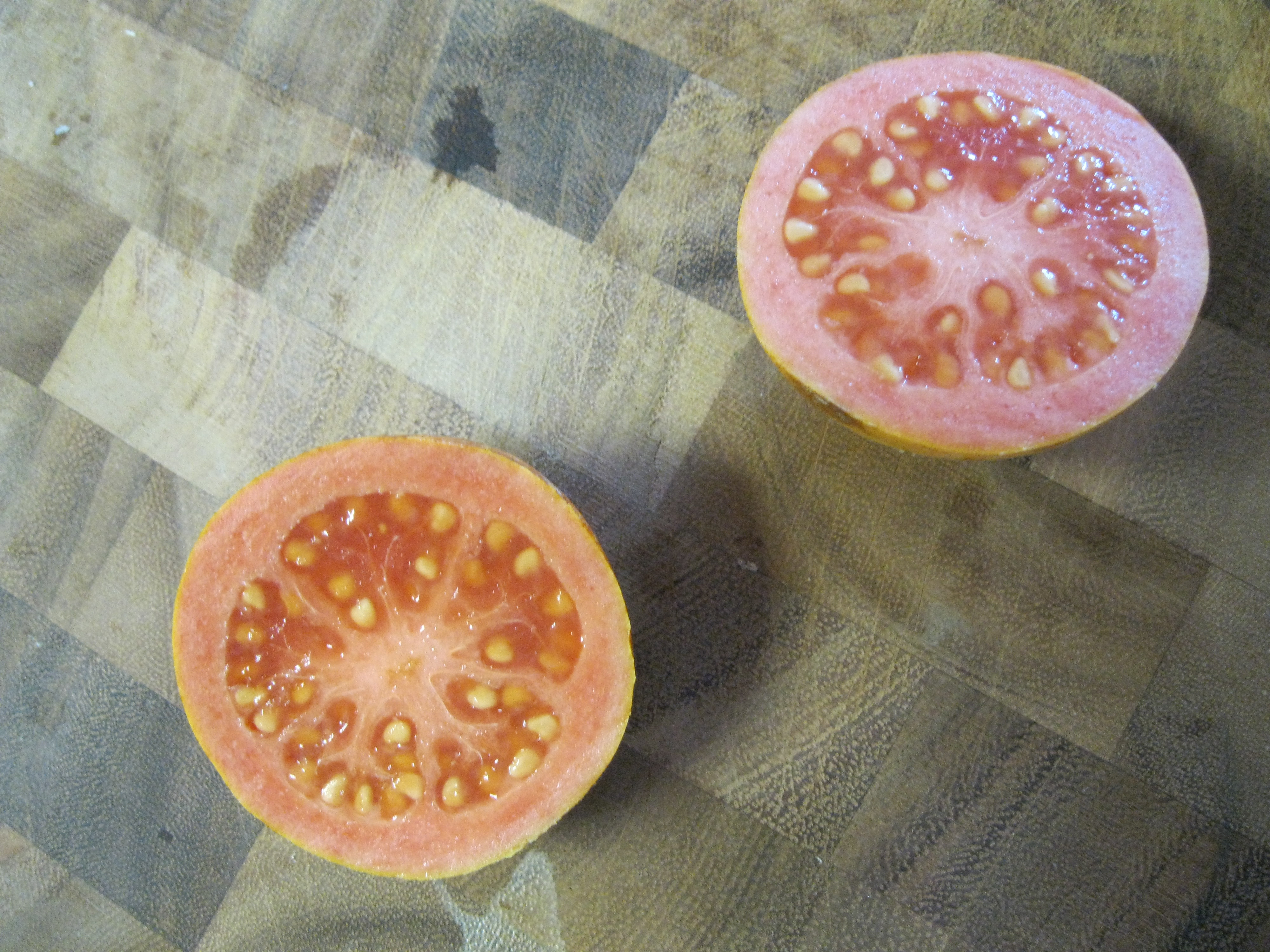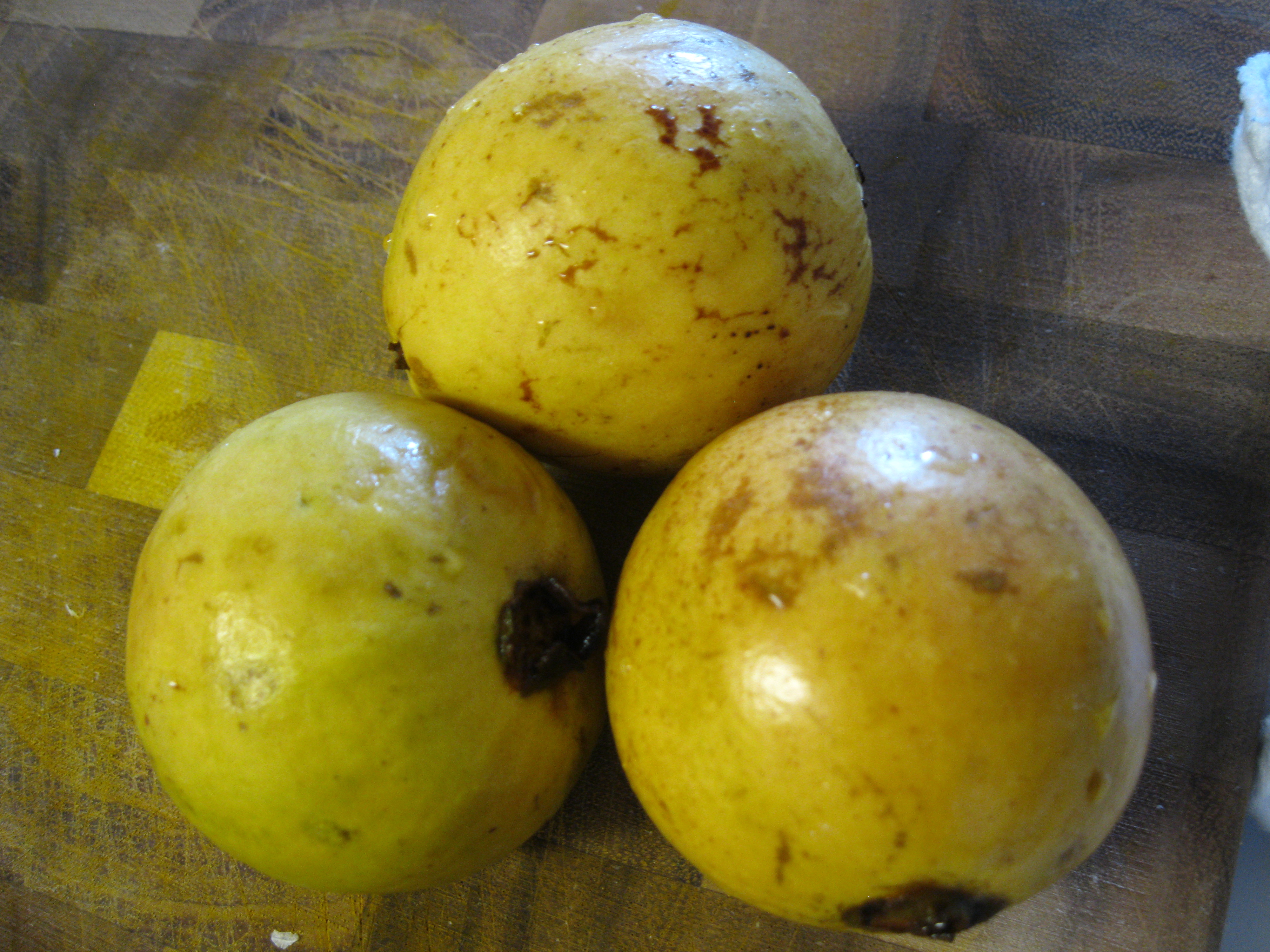 These were about the size of baseballs and smelled fragrant when they were ready to eat. Apparently the fruits from these natives of Central and South America can range in size from ping pong balls to softballs depending on the variety. The seeds are inedible though I think I swallowed a few. They were really hard, but the pulp of the fruit itself tastes lightly acid and very much like a mix of mango and papaya. The flesh was a pale pink and the skin was a rich yellow. I think the next time I find some nice sized ones I’ll spread it on toast.