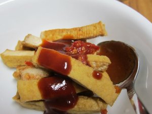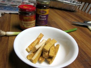 I got the plum sauce and chili garlic sauce from your everyday grocery store. I would recommend Lee Kum Kee brand for the plum sauce. My market didn’t have it and Dynasty brand worked just fine. I used a block of tofu from a package of fried tofu, bought at the Asian market. I cut the block into strips, but you can cut it into any shape you would like.