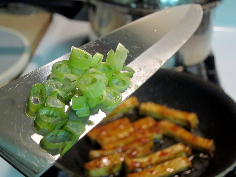 About two minutes after I put the tofu in the pan, I got a handful of the meaty green onion pieces and added it to the pan. I let it all fry for another minute, flipped the tofu, and then let it fry for another minute after that. Yeah. This only took about five minutes. Keep in mind that I started out with tofu that was pre-fried and already dried out. (Sidenote: my niece came into the kitchen to find out what smelled so good while this was frying.)