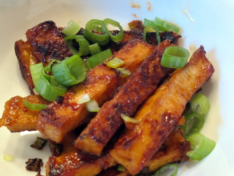 I topped the tofu with the rest of the green onion bits. The sugar in the plum sauce gives this a nice coating. I ate this with some rice and steamed broccoli and was very, very happy! –Melissa