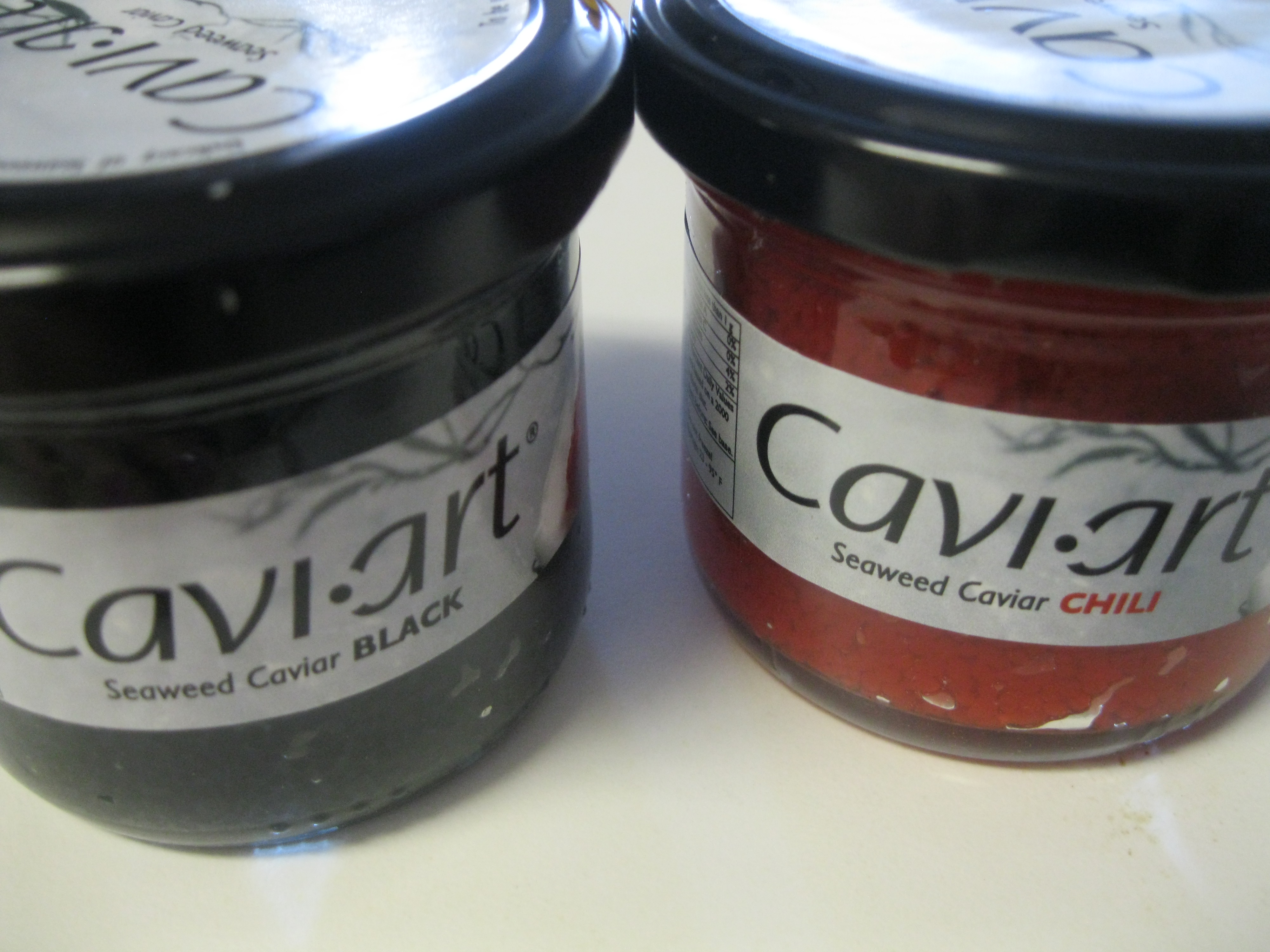 Caviart is made from seaweed and has half the calories of the real thing. They’re also rich in flavor and come in varieties like wasabi, ginger, ‘salmon’, black, red, yellow and balsamic (which I recommend with pesto).