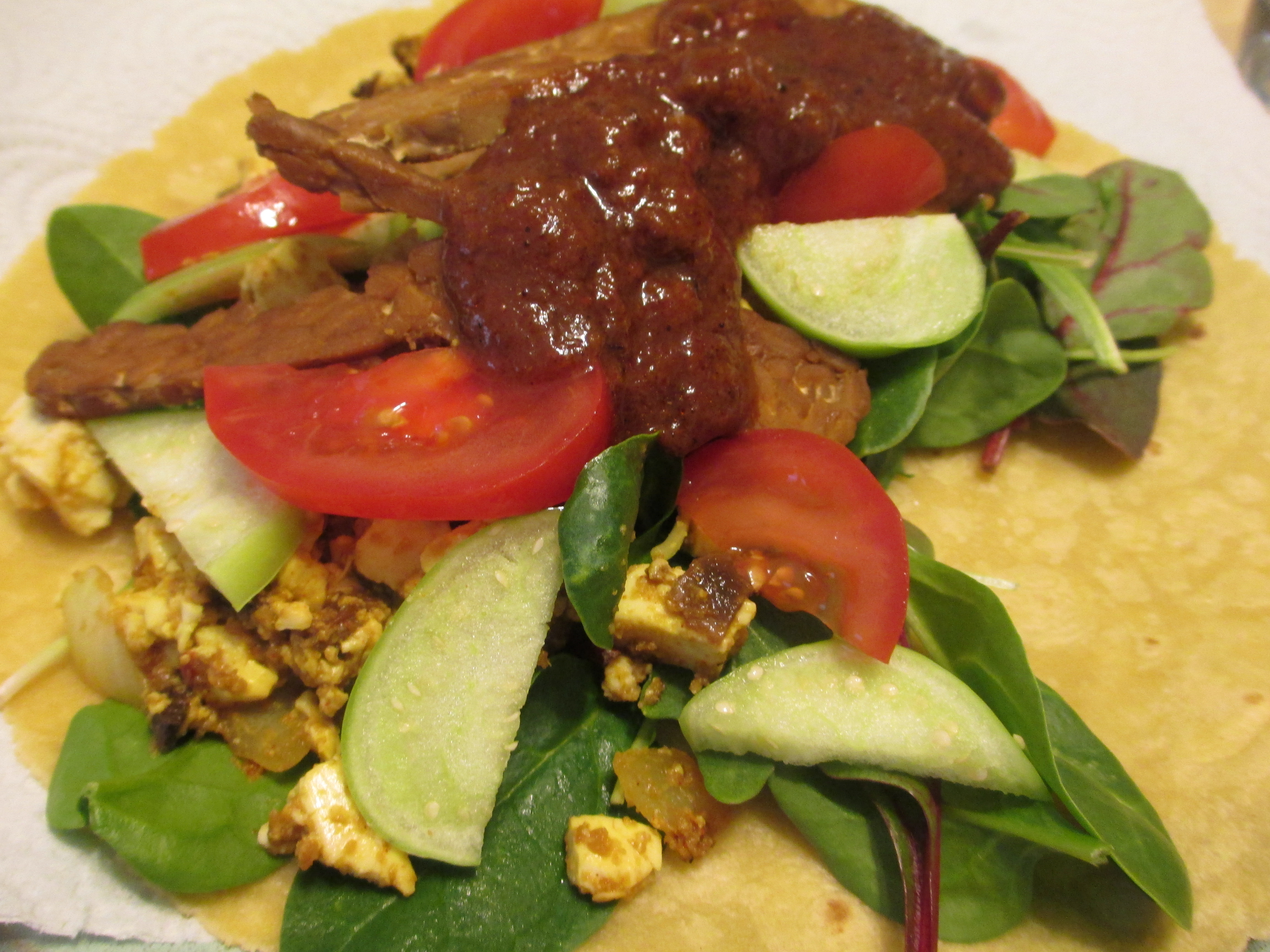 I did make our usual tofu scramble with some porcini mushrooms added for flare and sauteed some tempeh. I also chopped up some tomato and tomatillo which we layered on top of spring mix, scrambled tofu, tempeh and then covered with some ranchero sauce we bought.