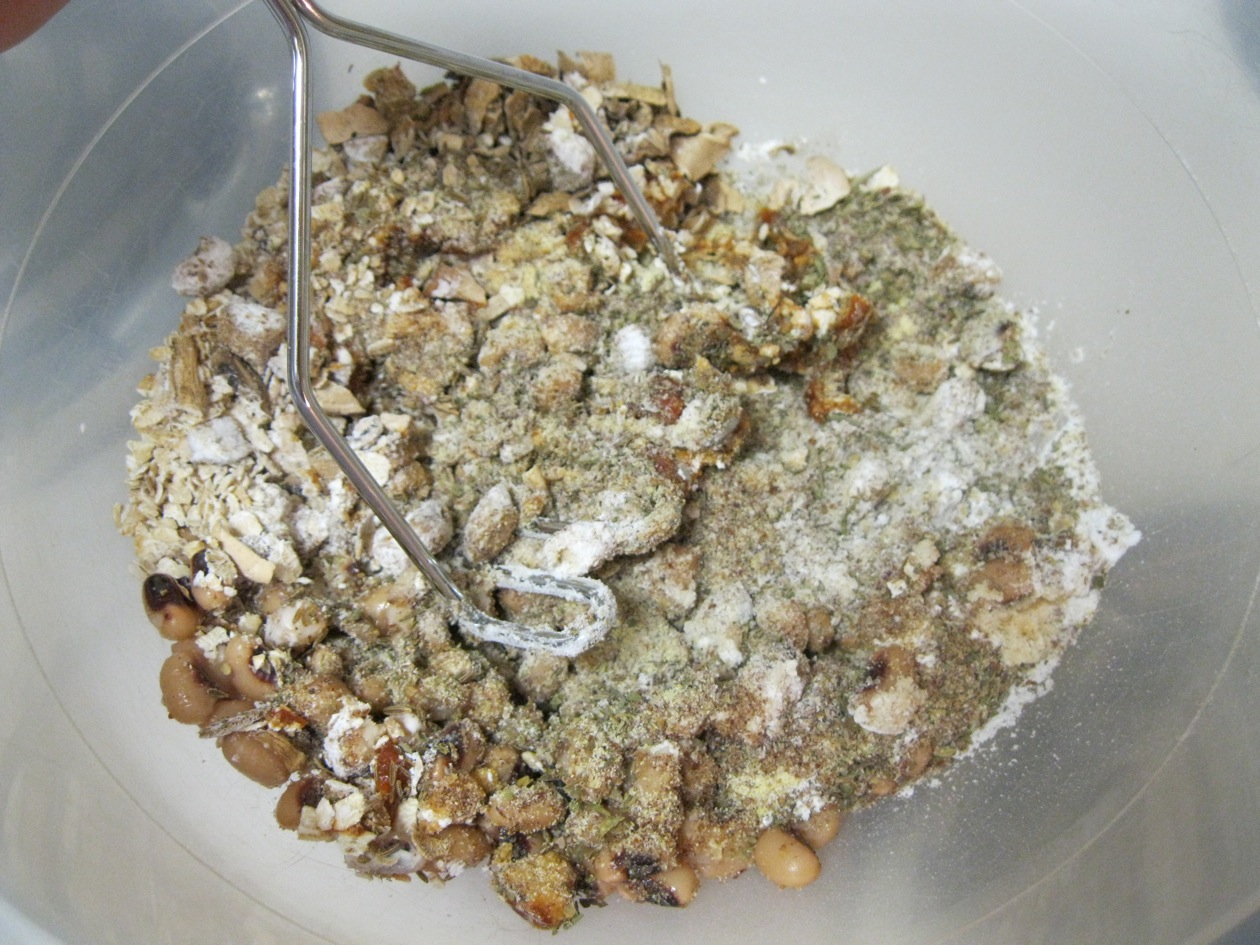 If you’re using dried beans, take a moment to microwave them in water 3-4 times at 2 minute intervals to soften them slightly. We put all the ingredients into a bowl and I set my expert moosher (that’s Brent) to power moosh. It wasn’t long before it was looking and smelling like burger material so I started scooping the mixture into some plastic freezer safe containers.