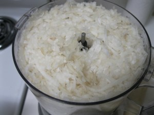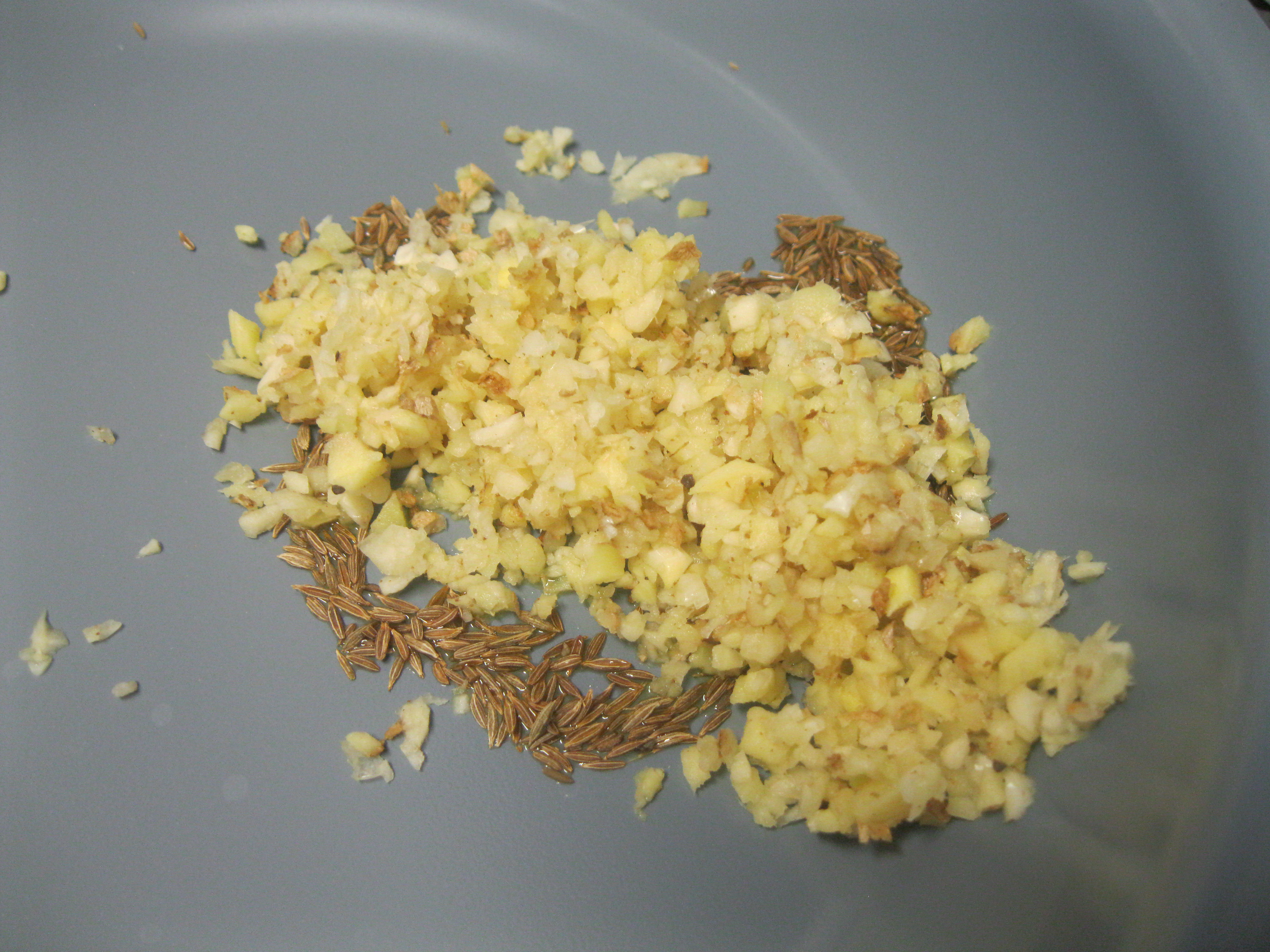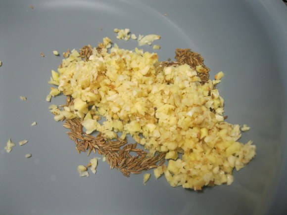 We combined the cumin seeds with minced ginger in a deep skillet with the olive oil. We stirred it over medium high heat until it was fragrant. We started the rice at this point because we used brown rice with took about 45 minutes. The curry was ready about 15 minutes before the rice.