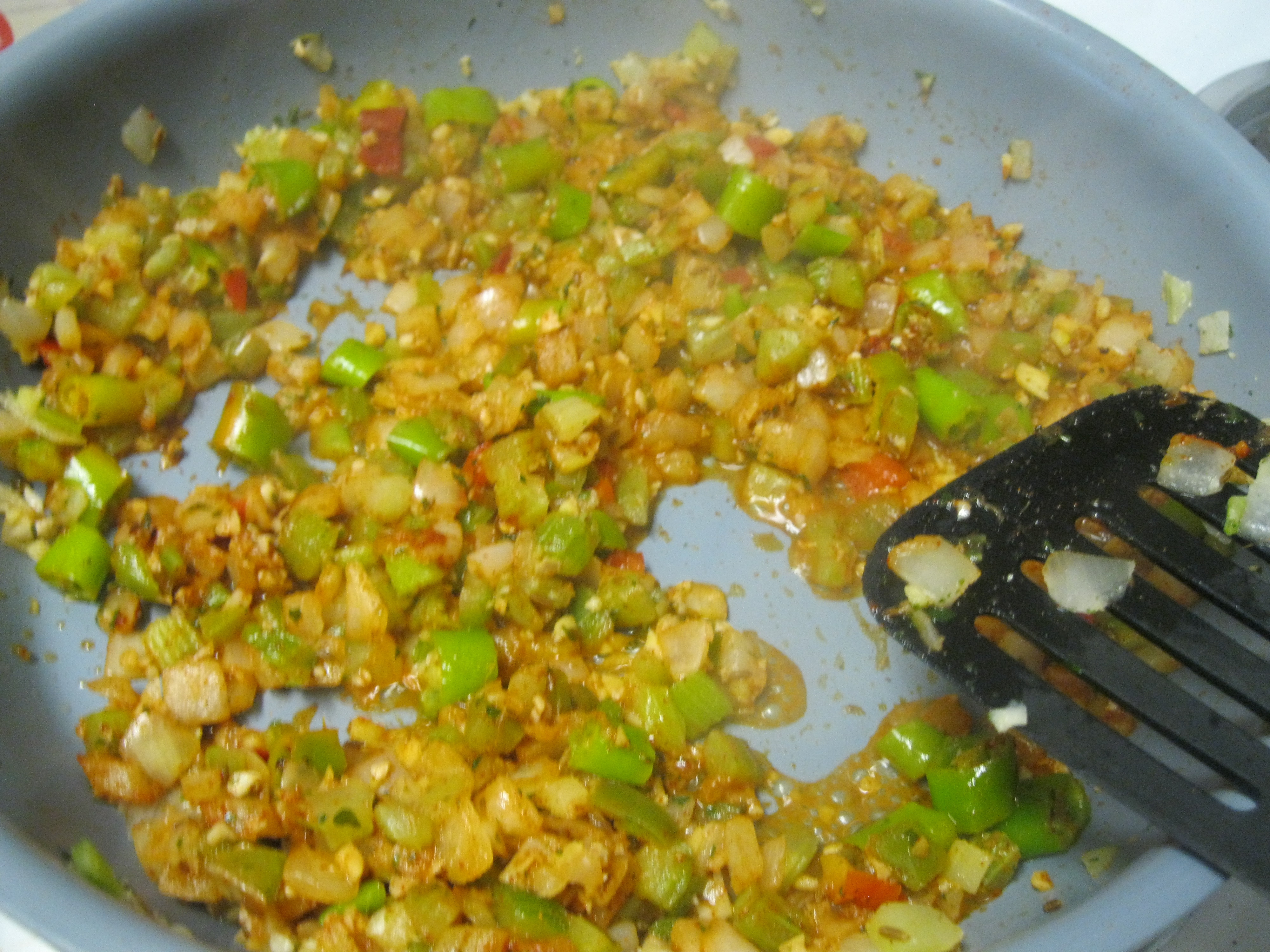 To this we added the seasoning mix of vegetables, peppers, cinnamon, PB2 in water and chickpeas. I stirred it until the vegetables were thawed and heated thoroughly.