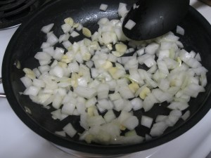 I put about half a liter of water into my sauce pan along with a bouillon cube. While I was waiting for the water to boil, I added the onion, garlic and olive oil to one of my fry pans and Brent heated them until they began to sputter.