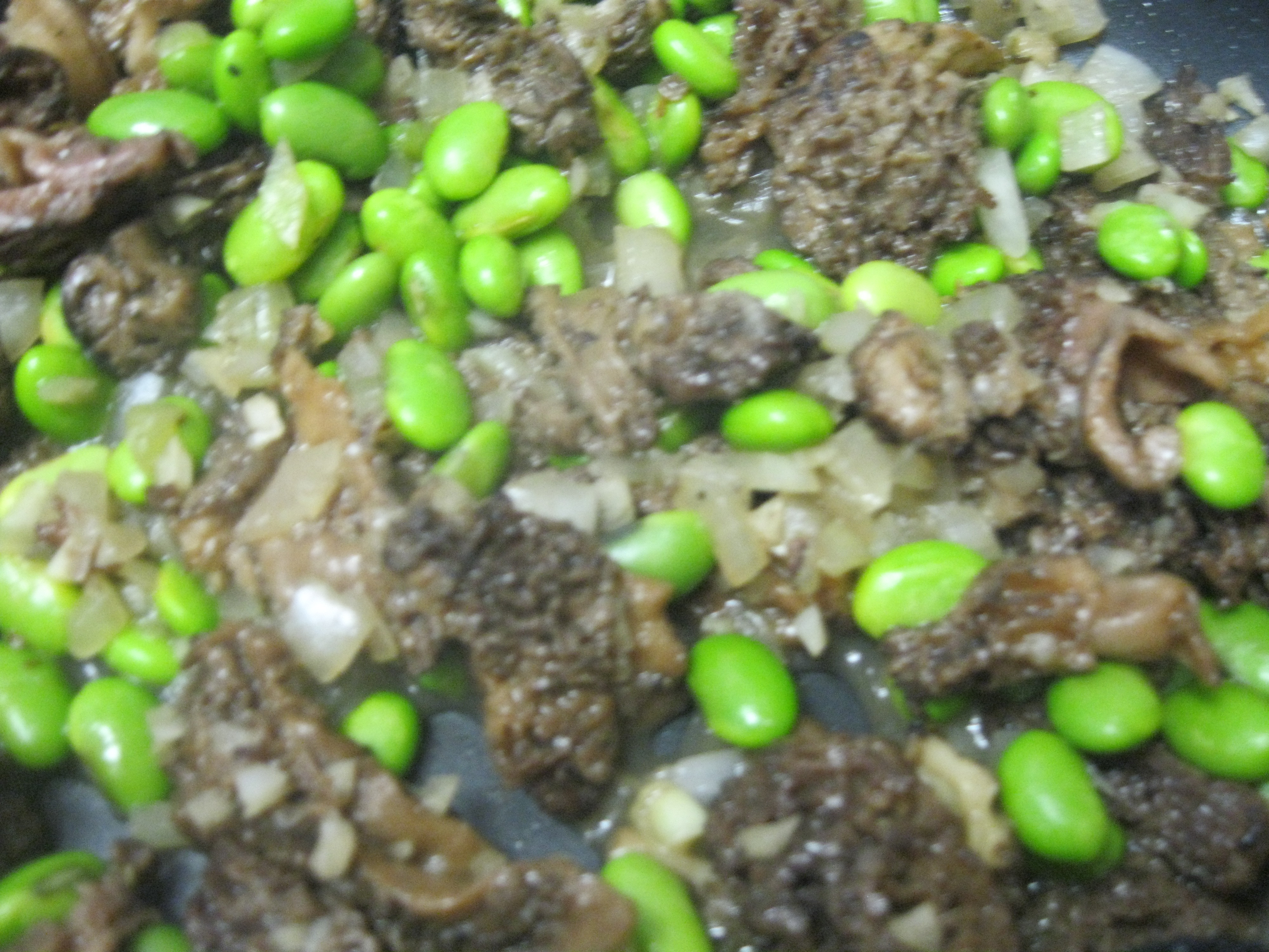 My next caveat about morels is that they need to be cooked thoroughly. They do contain compounds that can cause gastric upset if they’re not cooked well enough or you might have an unpleasant evening. That being said, some people are just sensitive to the compounds in morels, especially if they are trying them for the first time so consider using them sparingly and using conventional mushrooms for the bulk of the dish. I sauteed mine in some olive oil with a chopped onion, 4 minced cloves of garlic and after the morels started t reduce, I added a cup of frozen edamame, peas are a great alternative if you’ve got a soy allergy.