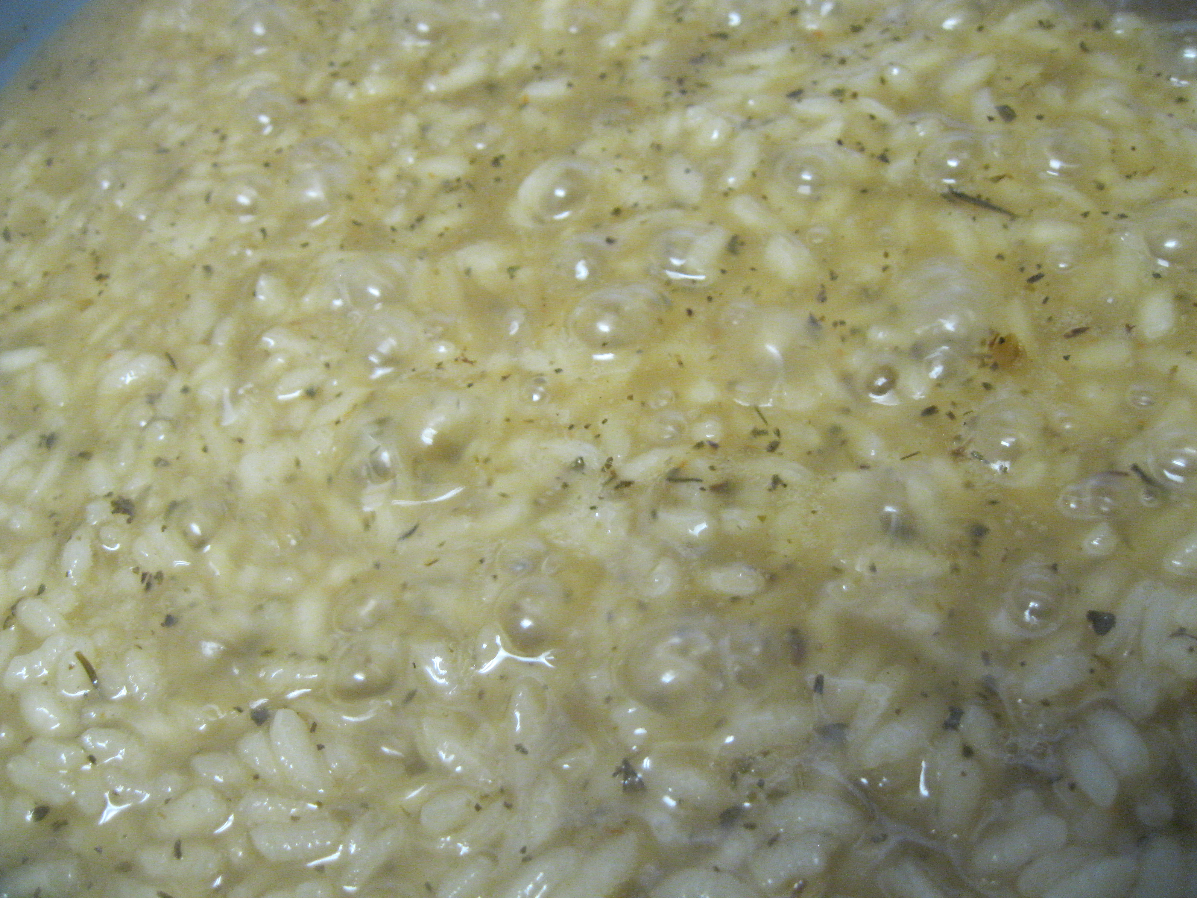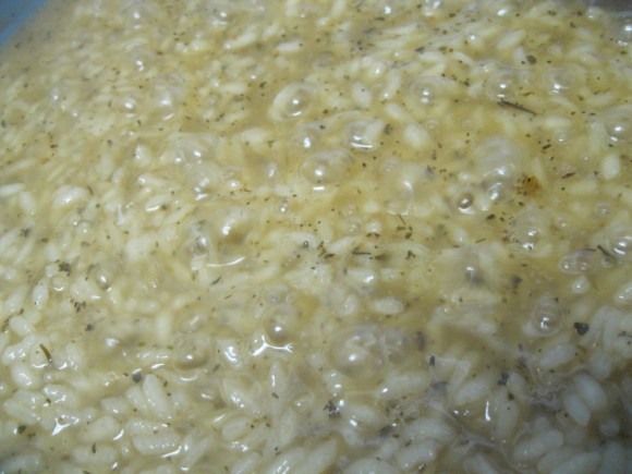 I added the veggies and turned the heat to medium-low while my extraordinarily good looking sous chef began cooking the rice. We put the rice in a fry pan with a cup of wine and a generous pinch of herbes de provence. I turned the heat to low.