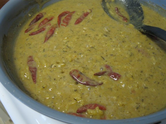 I melted the frozen puree over medium-high heat in a sauce pan adding the dry spices. When the puree was melted and everything was getting steamy I adjusted the seasonings and added the corn and cilantro leaves. I stirred it in and reduced the heat to low until I was ready to serve.