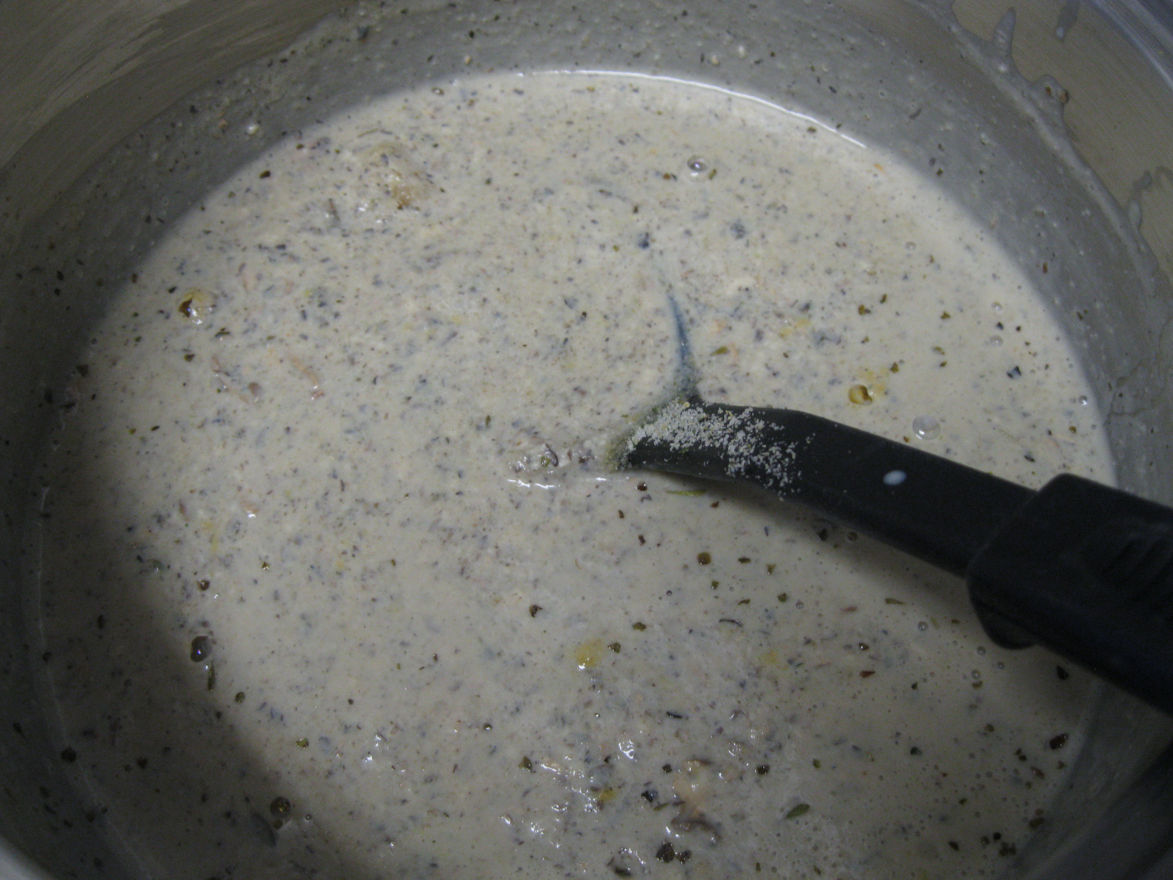 I combined the white wine and tofu in my blender and blended it until smooth. Then I put the onion and mushrooms in a pan and sauteed until the onion was translucent. I added the rest of the ingredients, adjusted the seasonings and then added water until I liked the texture.