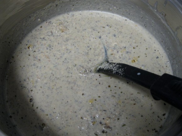 I put the block of tofu into my blender along with the cilantro and bouillon cube. Whenever I use leaves from cilantro I put the stems in a bag in my freezer for use in recipes like this one. Freezing preserves the aromatic compounds that give cilantro it’s unique (and to some offensive) flavor that is lost in dried coriander powder. The stems are also very flavorful and full of fiber. I blended the tofu until it was creamy.