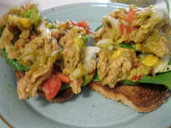 We combined this on a wrap with some Daiya cheddar which we melted by microwaving and then topped with some spinach and tomato. It hit the spot, EXACTLY!