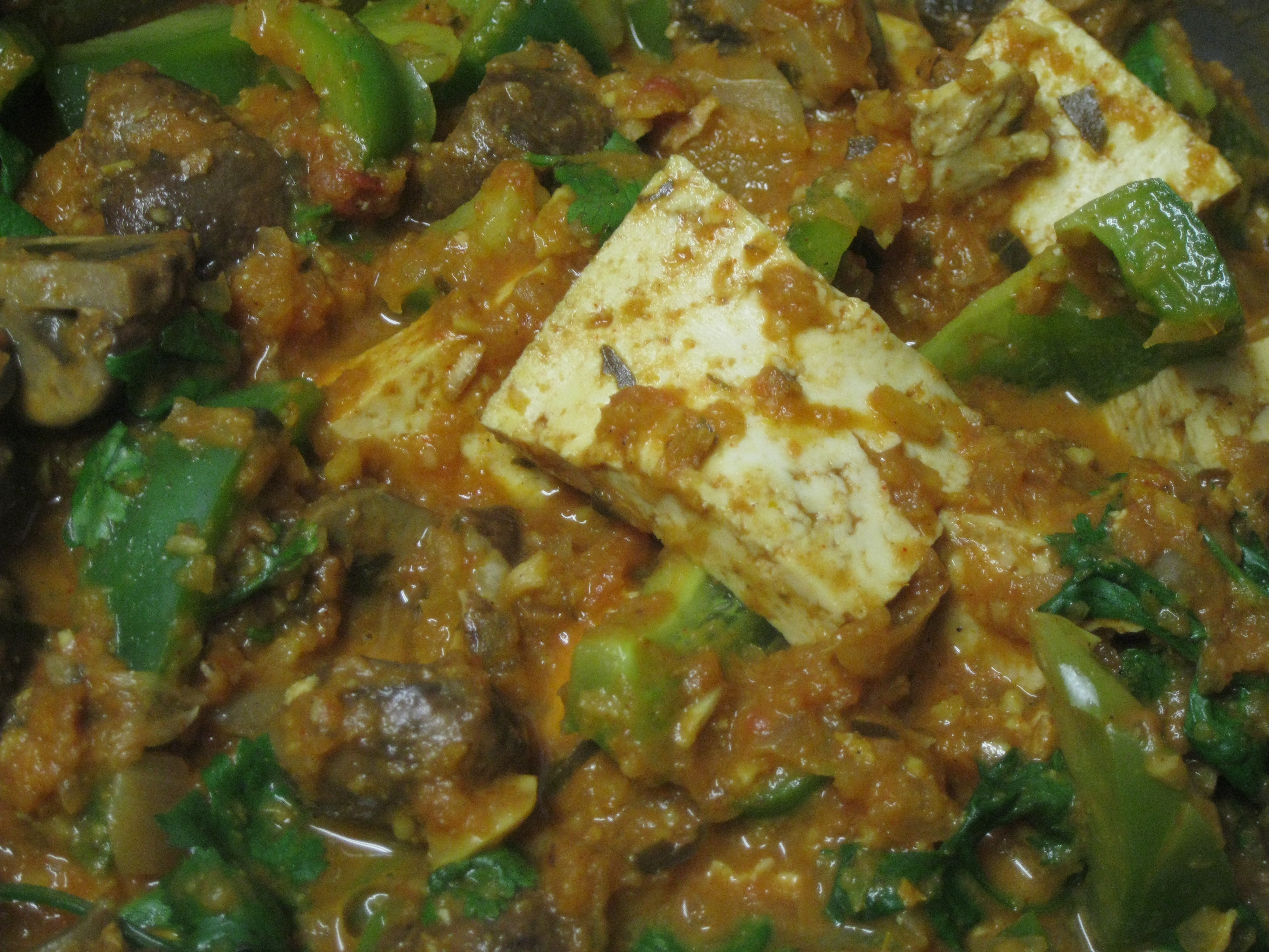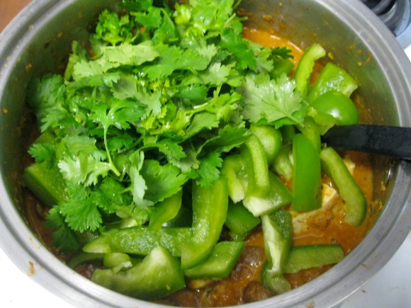 Add the tofu and mushrooms and allow to simmer for at least 45 minutes so the tofu takes on the flavors of the dish. Stir in the green bell pepper and coriander 10 minutes before serving.