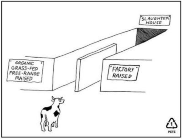 I’ll take us back to the question of ‘humane meat’ being a happy medium versus veganism. This will sound like a slippery slope argument and in part it is so bear with me. Veganism, being too extreme, opens the door for something arguably less extreme like ‘humane meat’. Now consider that the vast majority of meat in America today is produced on CAFOs and that the cost of producing humane animal products can be prohibitively expensive. Avoiding inhumane animal products sounds like a full time job for anyone with considerable disposable income. So how is ‘happy meat’ not extreme in and of itself?