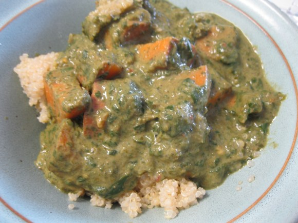 I transferred the contents of the blender to my big pan and rinsed out the blender with almond milk (use soy if you’ve got a nut allergy) and put the milk into the pan. I started to heat it and added 1 sweet potato cut into bite sized pieces. A carton of water packed tofu or a few handfuls of mushrooms are great veggies to add to your saag.