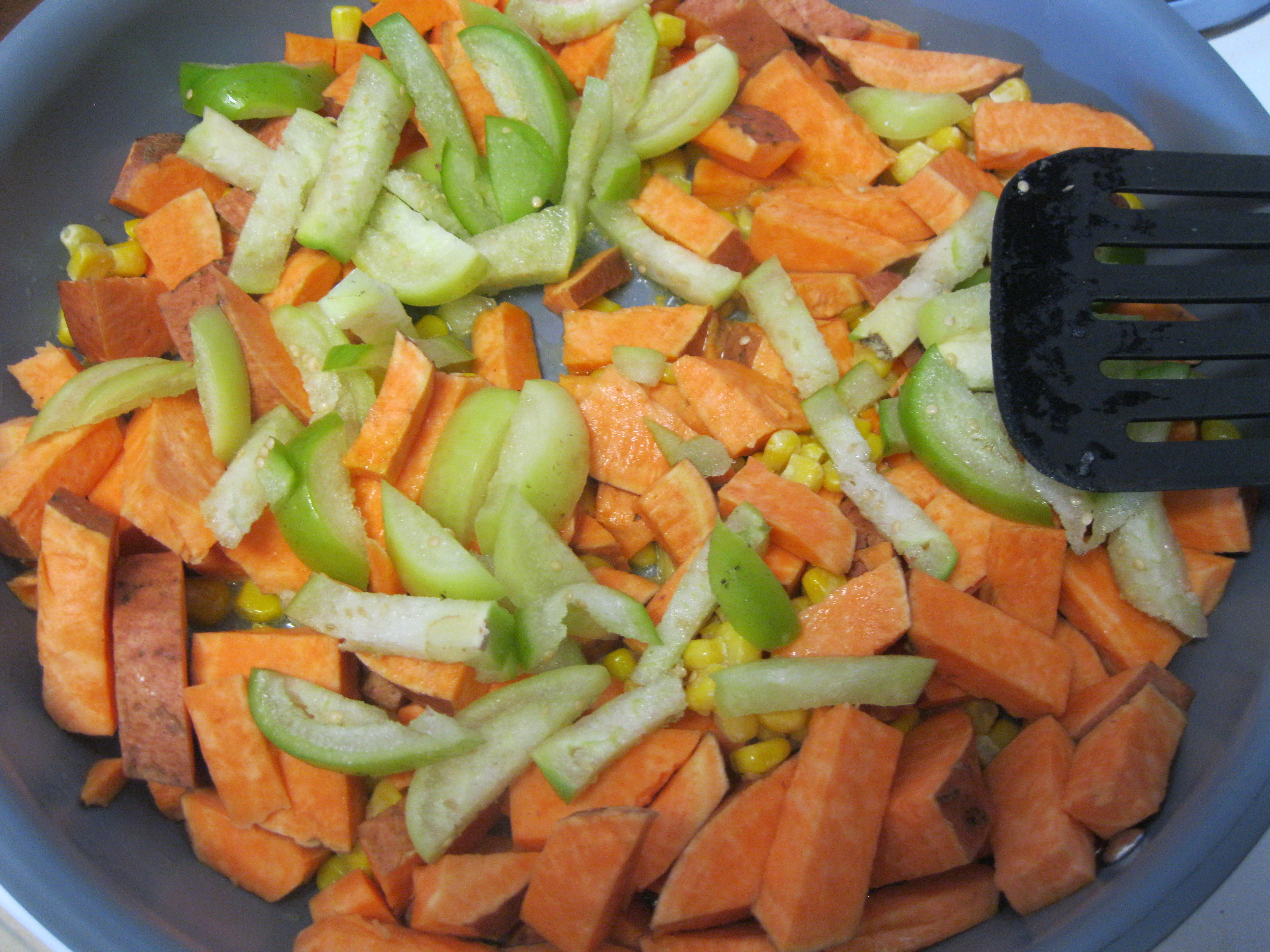 Heat a large skillet on medium-high with 1-2 tbsp Earth Balance until it melts. Swirl to coat the pan. Add the corn, sweet potato, scallion, paprika, garlic salt. Stir occasionally until the sweet potato is soft.