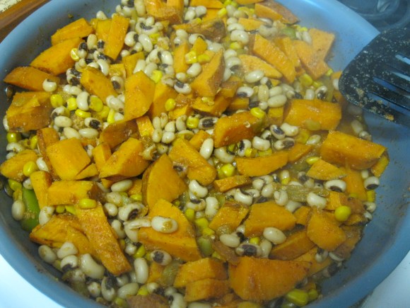 Add blackeyed peas and stir to mix well; cook 1 more minute or until sweet potato are soft and blackeyed peas are warm through. Transfer mixture to a casserole dish.