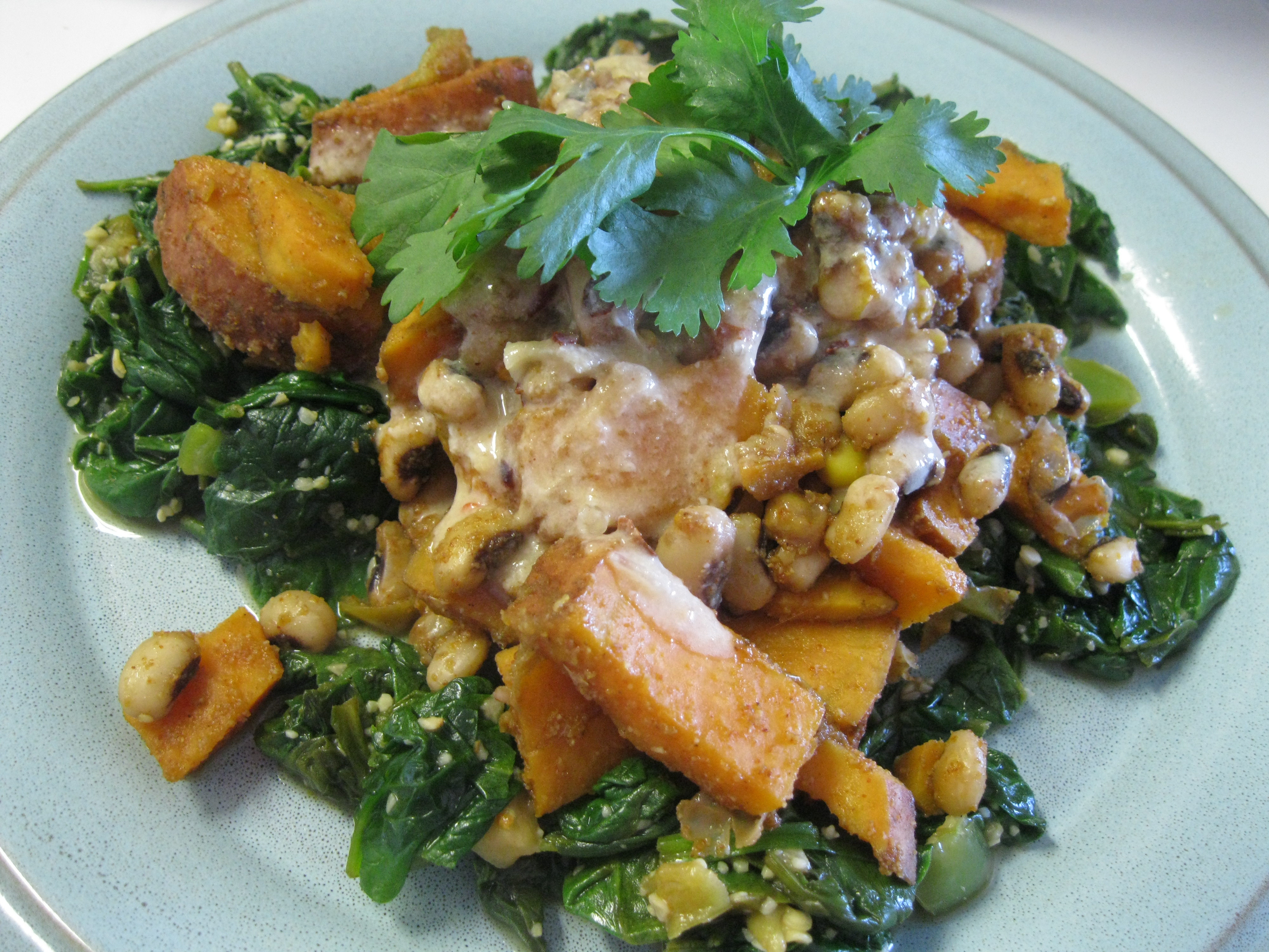 I served mine with spinach that I prepared with garlic and jalapeño. I plated the spinach and add the roasted corn, yam, and blackeyed peas mixture to the center of the spinach. Add the spicy peanut lime sauce as desired, sprinkle with cilantro and serve.