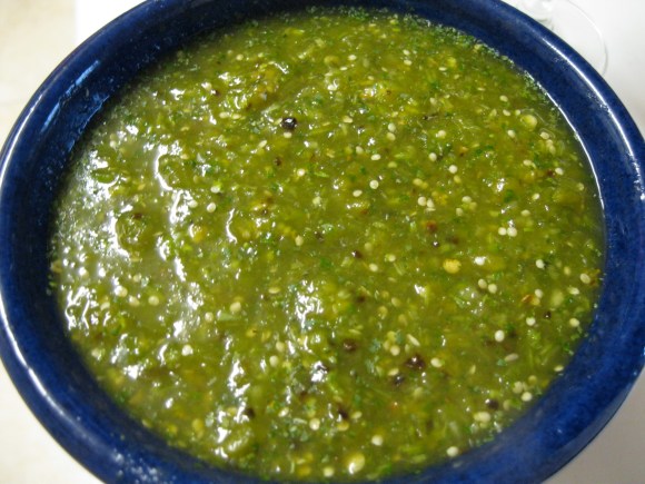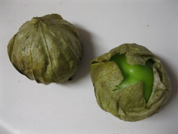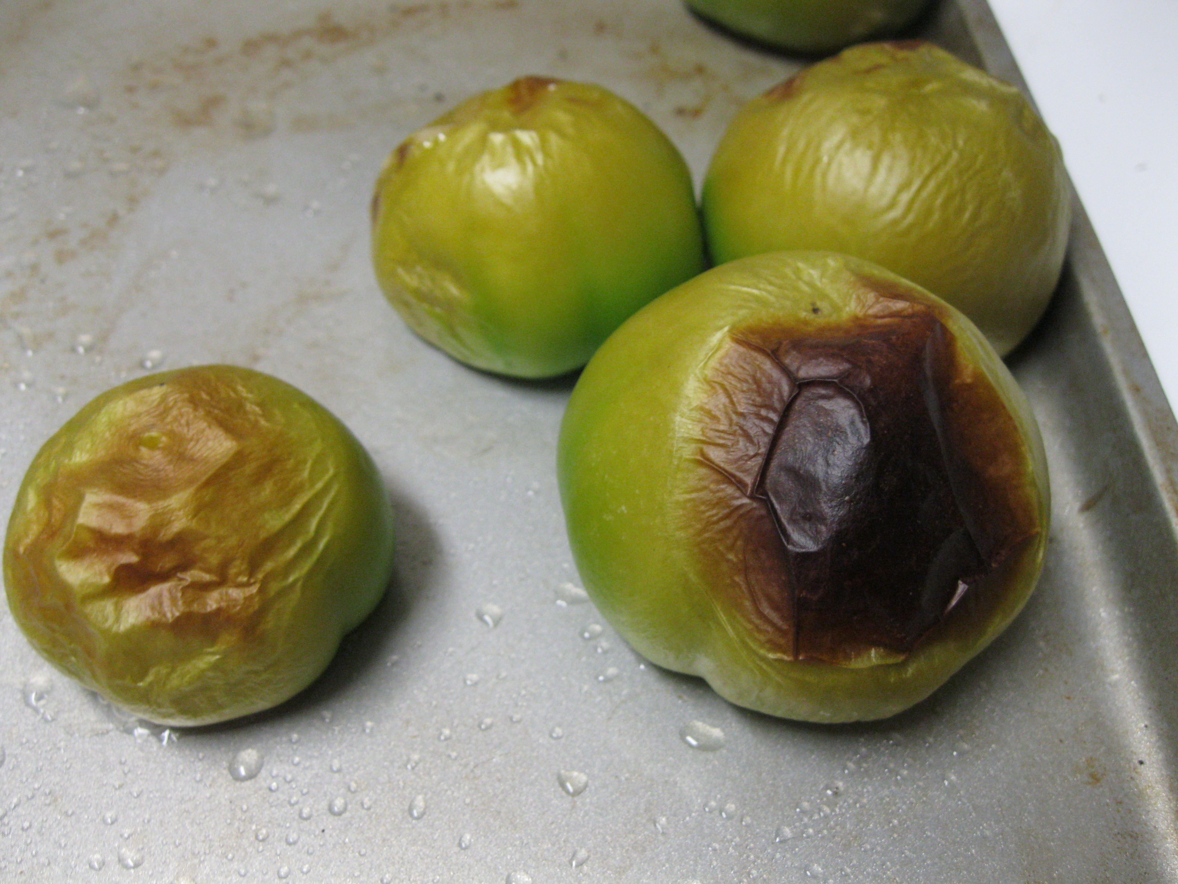 First, pre-heat your oven to 400F/205C. Grease a baking sheet lightly and put your tomatollos (whole but papery husk removed) on it. When the oven is hot, put them on the top rack near the broiler coil. This particular day it took only 8 minutes to blacken the skin (above). I wish I knew a better way to time this stuff without lighting them on fire but all I can advise is to watch them closely after 5 minutes. When they’re done, set them aside to cool. Also, don’t forget to turn off the oven.