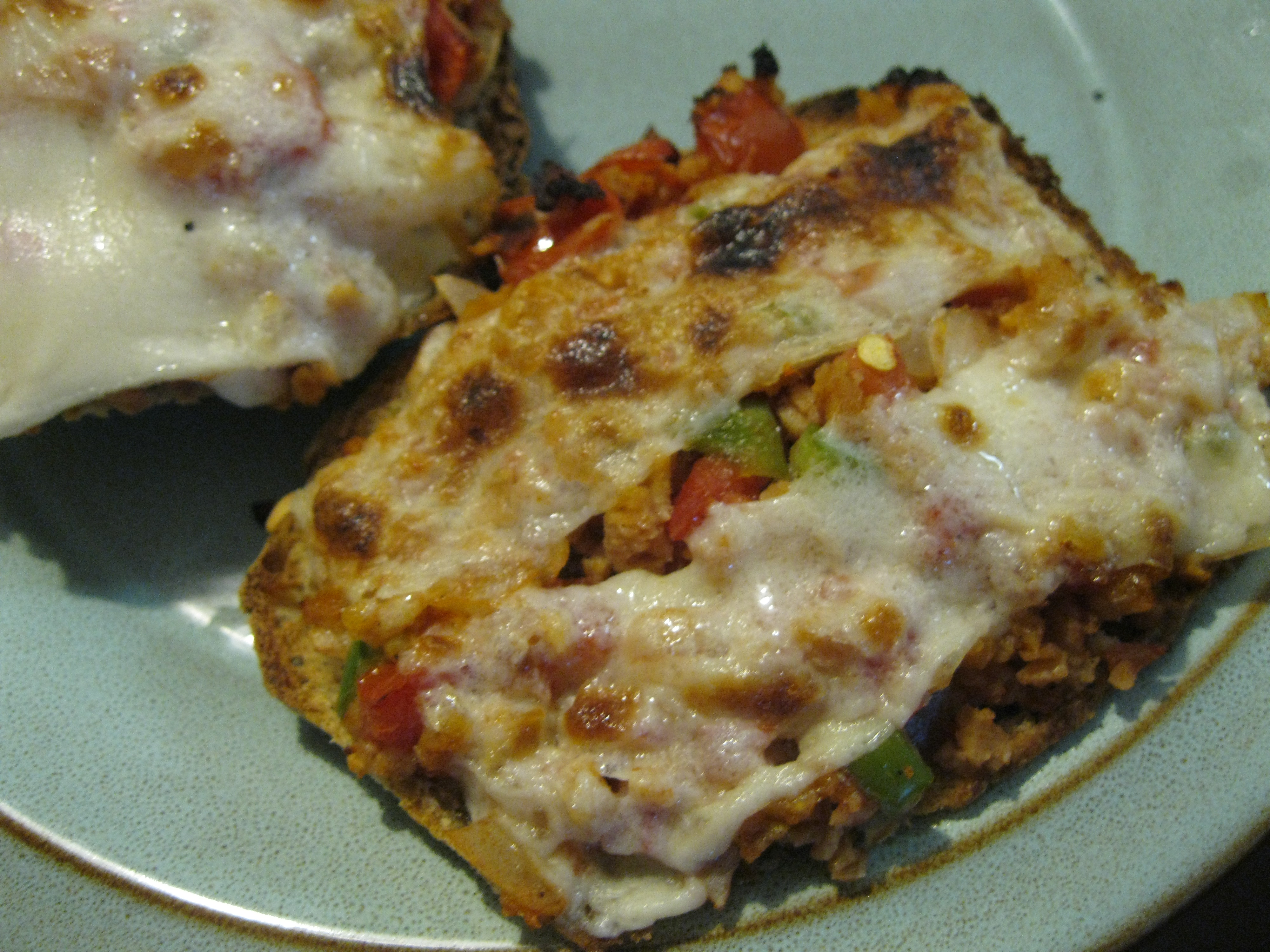 I spooned the mix onto my bread (this is gluten-free and vegan made by a local lady), added a few slices of Follow Your Heart mozzarella and baked it up near the broiler so it would get toasty and delightful. It was at 400C/200F and for about 5 minutes. Watch it carefully.