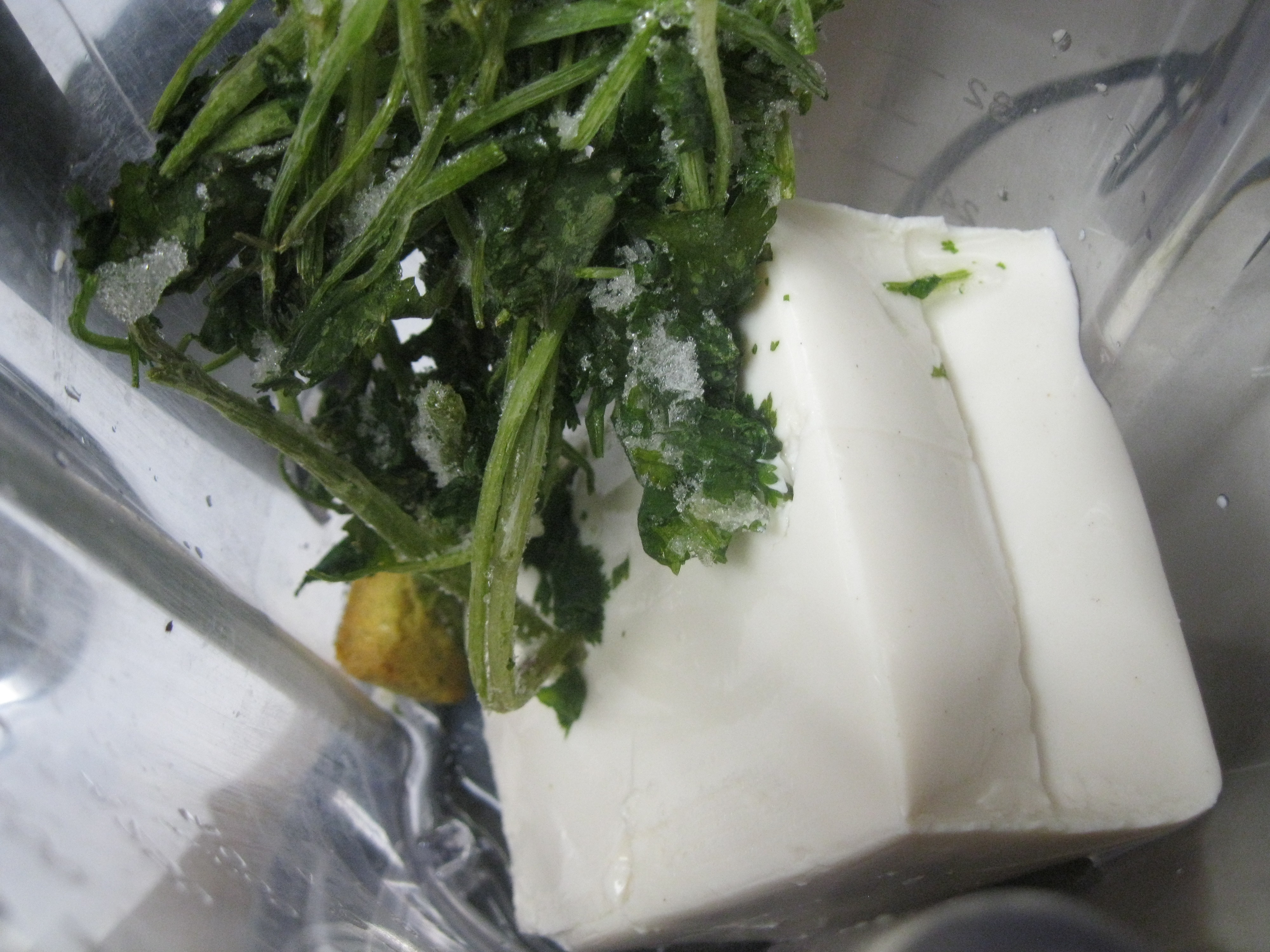 I put the block of tofu into my blender along with the cilantro and bouillon cube. Whenever I use leaves from cilantro I put the stems in a bag in my freezer for use in recipes like this one. Freezing preserves the aromatic compounds that give cilantro it’s unique (and to some offensive) flavor that is lost in dried coriander powder. The stems are also very flavorful and full of fiber. I blended the tofu until it was creamy.