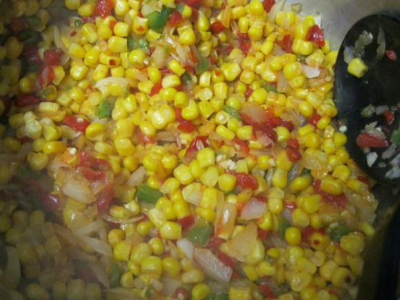 When the onion had become translucent, I added the flake red pepper and frozen corn  and continued stirring until it was thawed.
