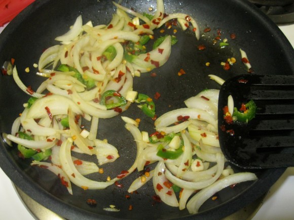 I started by sauteing a chopped onion with a diced jalapeño, chopped garlic and some flake red pepper. When the onion began to soften I added some soy curls that Brent prepared with some Brag’s amino acids and cayenne pepper.