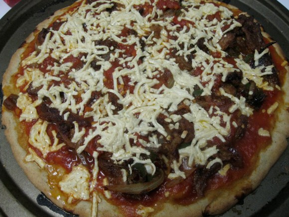 I topped the crust with some salsa and then my fajita mix and then some more salsa. We topped it with Daiya mozzarella (though pepper-jack might have been better) and then I baked it according to Zen Cat bakery’s instructions.