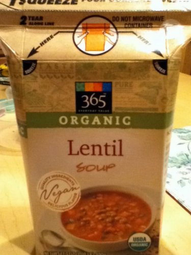 When I go to Whole Foods these days, it’s usually because I’m on the hunt for something very specific that I can’t find anywhere else, or because it’s the most convenient place to go for certain items. Examples include Chicago Diner vegan desserts (which are available in Whole Foods stores throughout the Midwest) or a Field Roast or Tofurky frozen pizza (I want it when I want it). One really nice thing that Whole Foods does is offer coupons that are actually very decent deals. I end up trying new things because I have a coupon. One new thing that I tried recently was 365 Organic Lentil Soup.