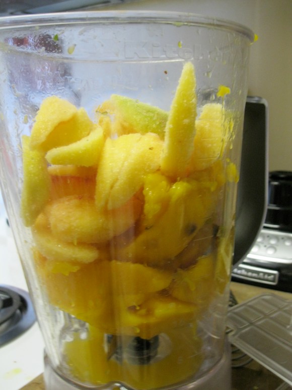 This is an incredibly simple drink and mango is in season here in Florida. I figured I’d honor our local bounty and make something really fresh (like from the tree in our backyard) and that’s sure to please. We typically collect our mango as they’re available and peel and then freeze the flesh in 16 ounce containers.