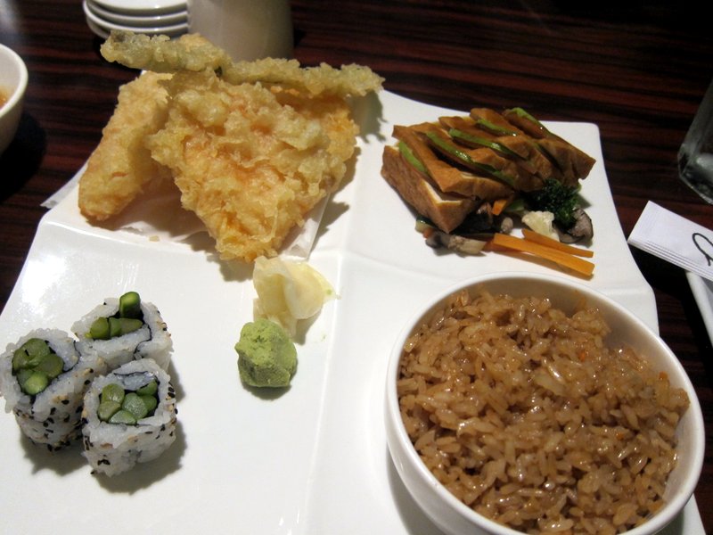 I cooked the tofu by baking the entire block in a toaster oven at 350 degrees for about 12 minutes. While it was baking, I took some brown rice and quinoa that I had in the fridge and heated them together in a pan, seasoning it with soy sauce and some garlic powder.