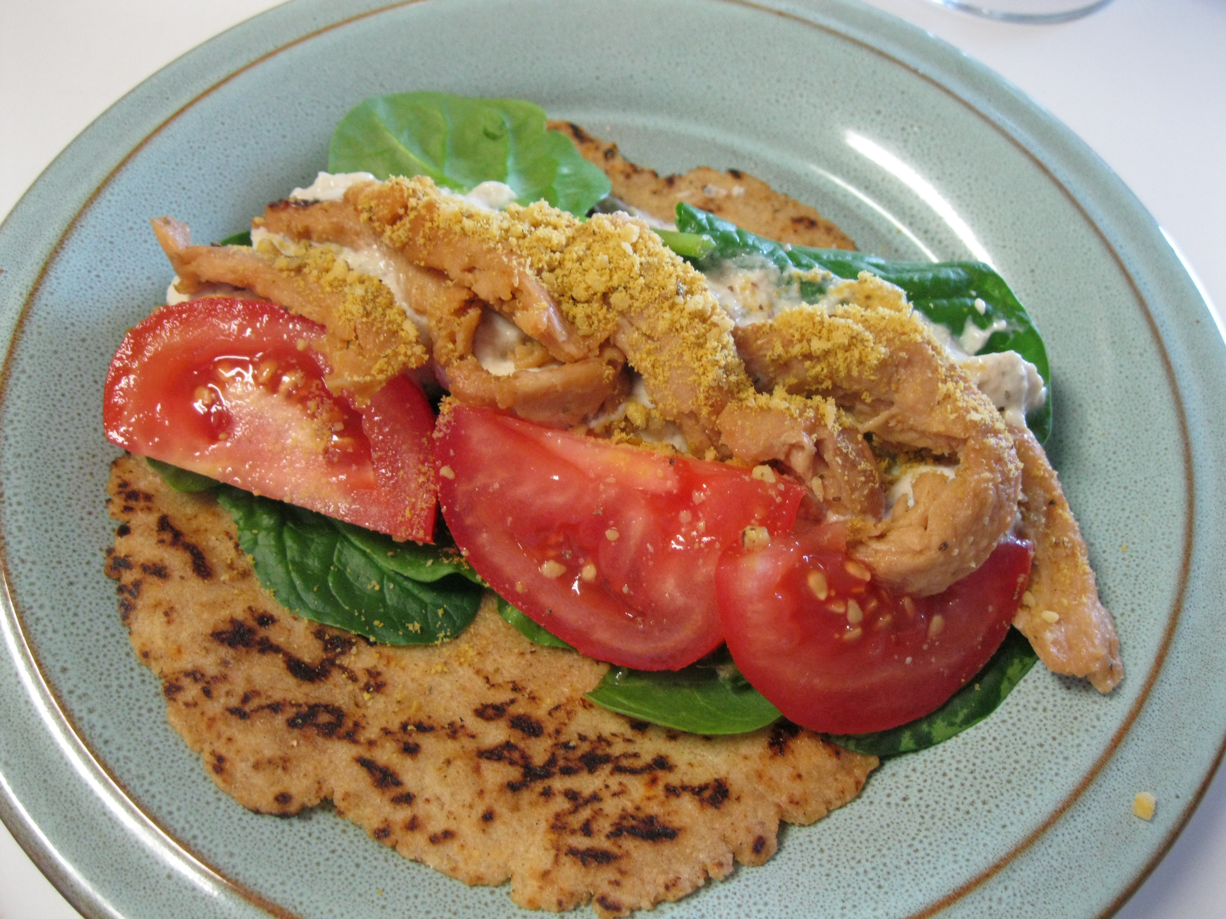 We combined it with soy curls prepared according to the package directions and baked until crispy, spinach, tomato and Eat in the Raw vegan parmesan and wrapped it up in Hayle’s red chili tortillas for a healthy vegan dinner. It was quite a treat!