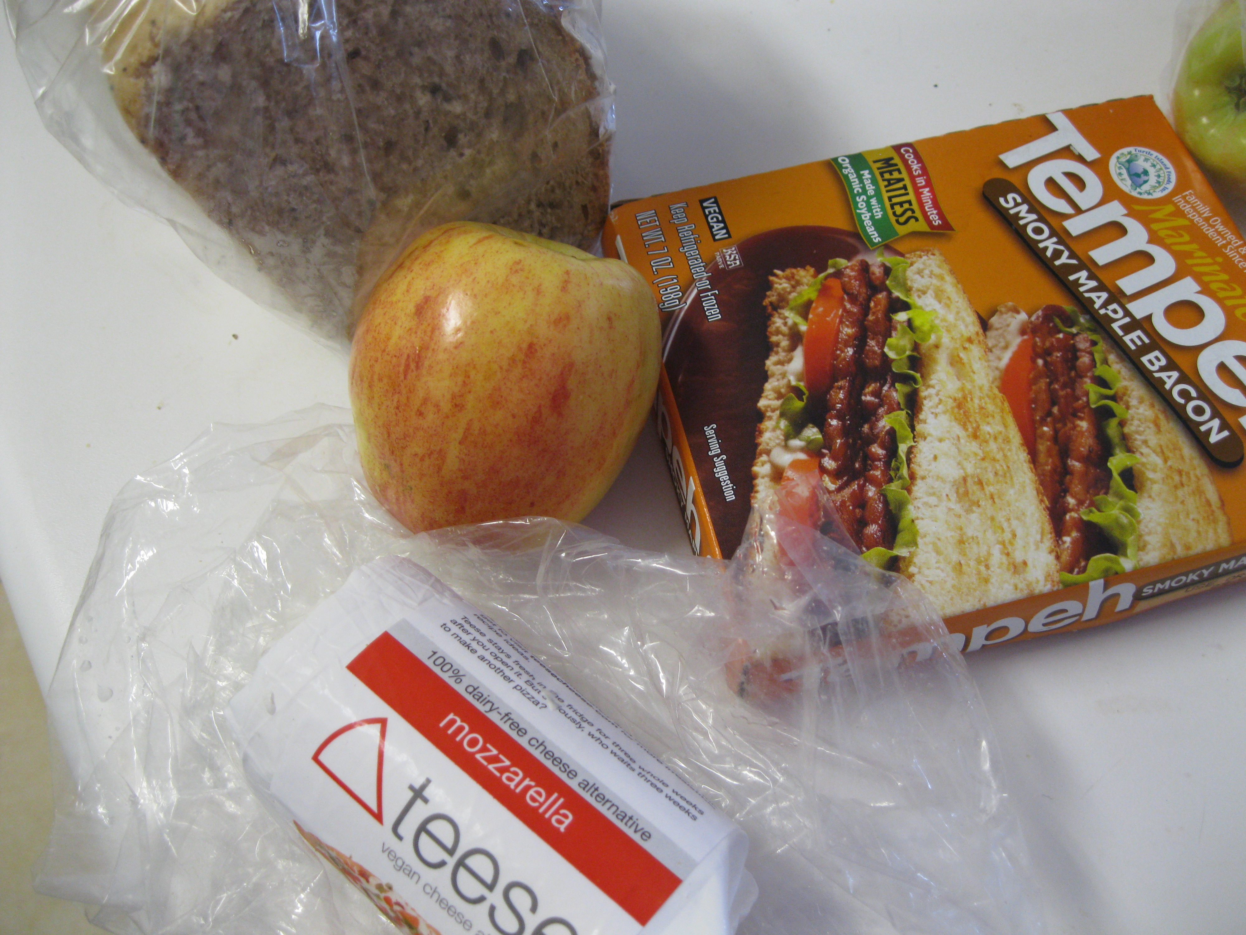 We browned some smoky maple tempeh while some multi-grain bread topped with teese mozzarella. This is bread that a local lady makes for us, gluten-free and vegan. She’s an incredible baker and I hope all of you who aren’t expert bakers and a few who cartinly are(I’m looking at you) can find vegan [gluten-free] bread that doesn’t taste like it’s been frozen between 2 pieces of cardboard in a diesel truck for 2 years. Well, that’s my opinion of most store bought bread. On to noms!