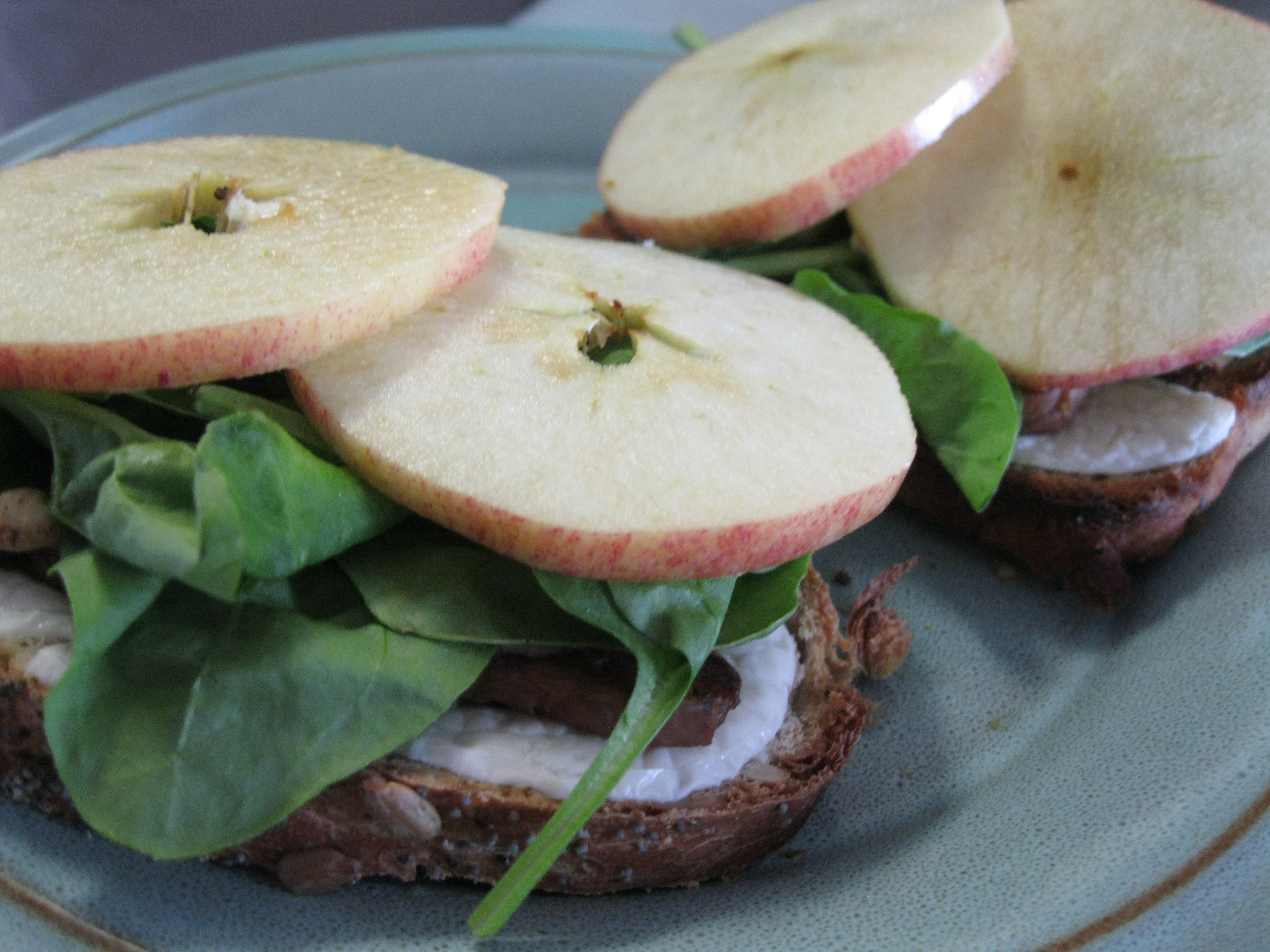 We stacked the tempeh on the bread with some spinach and apple slices. I like royal gala apples. They’ve got a buttery mellow flavor that isn’t too acidic. We use them to juice too!I like my sammies open faced (above) but Brent is more traditional (below).
