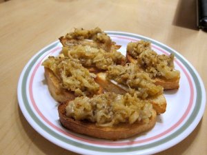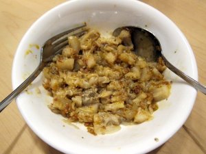 I put a little olive oil, the onion and garlic into a pan and sauteed them until the onion started to soften. Meanwhile I prepared the bouillon in a cup of water by heating it in the microwave. I added it to the pan along with the mushrooms, TVP and spices for the filling. I heated it on low until the mixture had absorbed most of the moisture.
