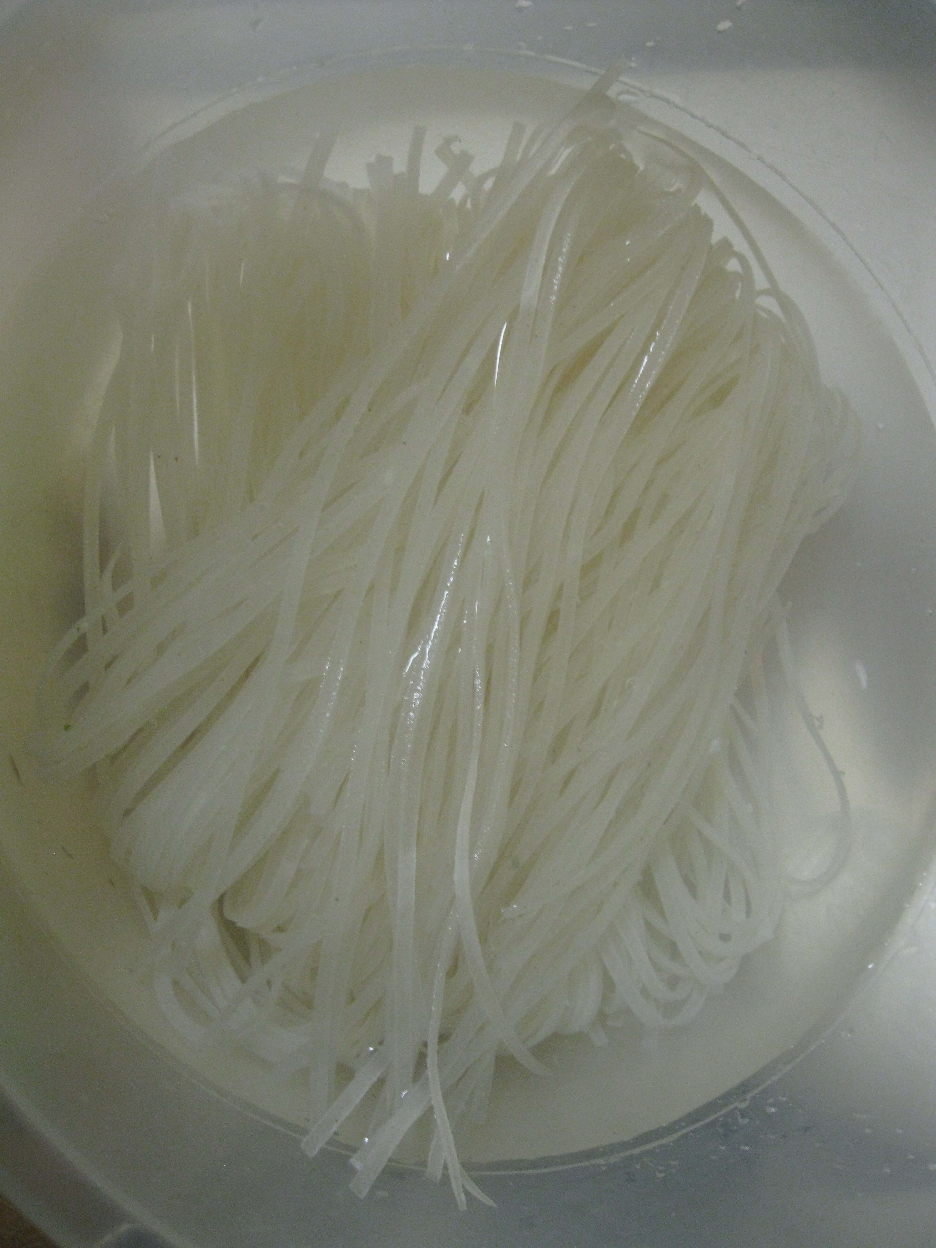 Before you do anything, break the noodles in half and place them in a large bowl of warm water to soak.