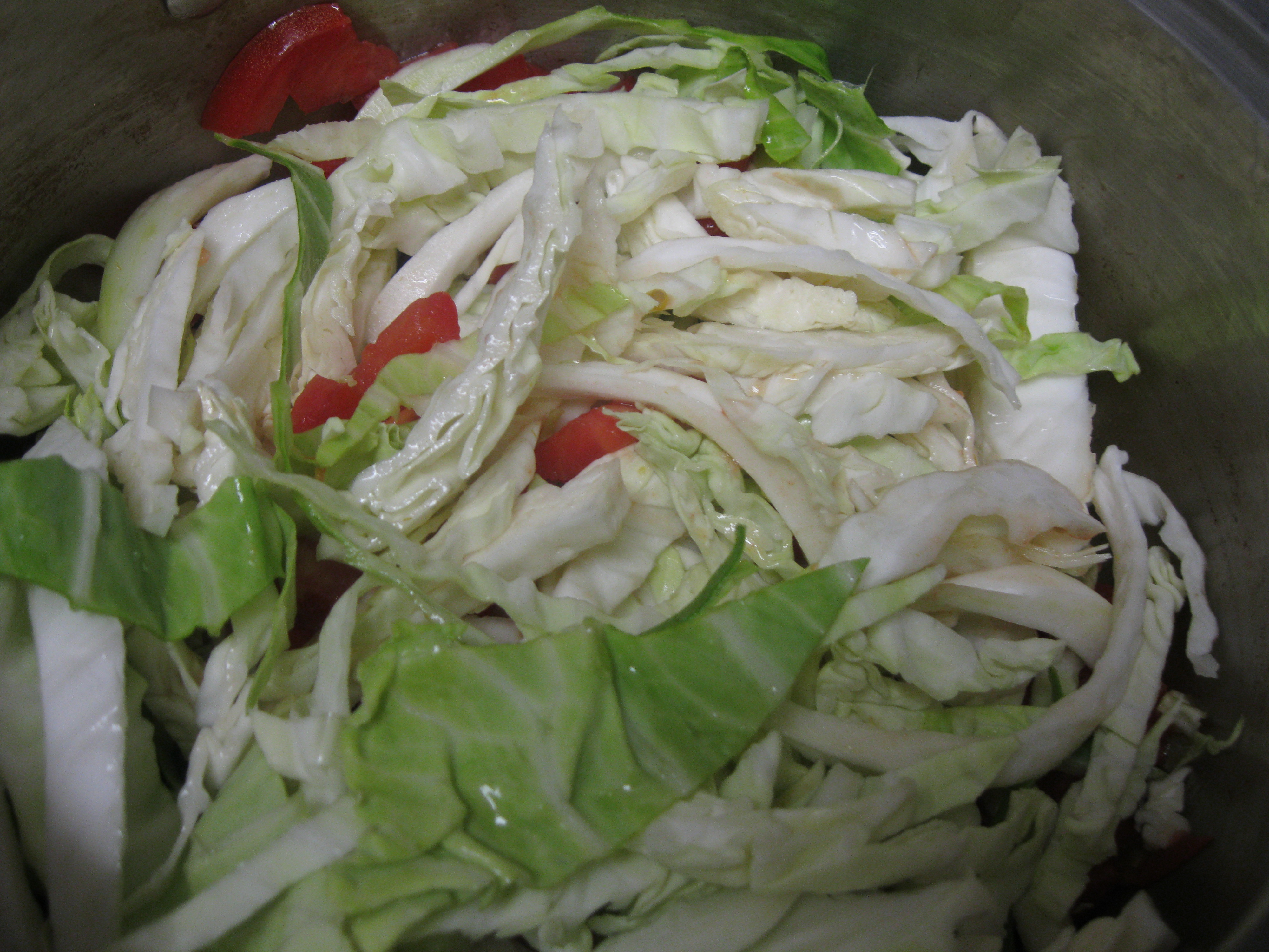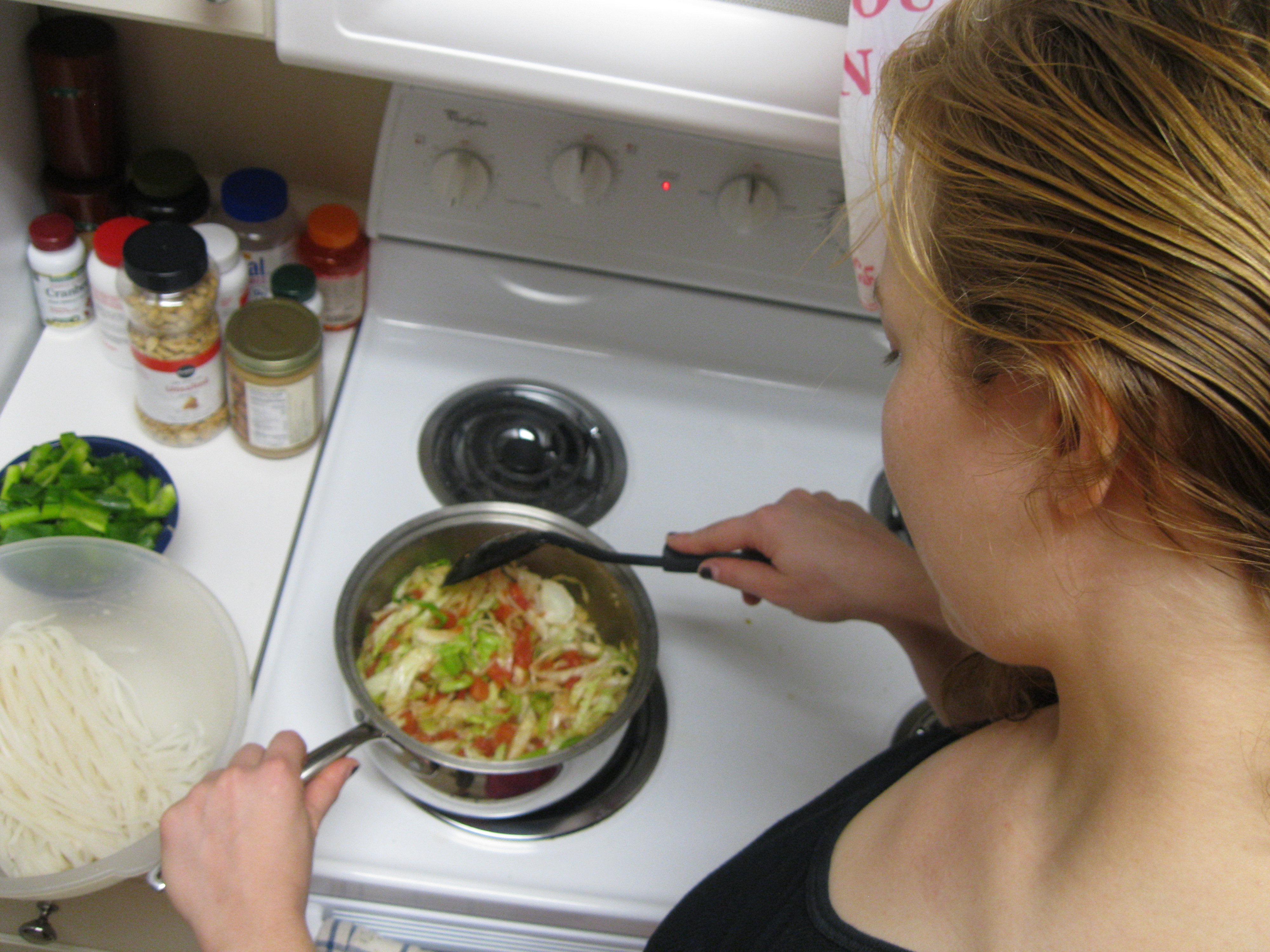 Then add the shredded cabbage or bean sprouts and stir the for 3-4 minutes. Drain the water from and add the noodles, they don’t have to be too dry. A little liquid is fine.
