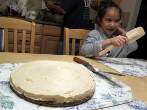 This cheesecake was kid-approved! It tasted great plain, but I also tried it with some chocolate syrup and topped with pomegranate seeds. I imagine it would be great with the cherry topping that Christie made for her ‘cheese’cake.