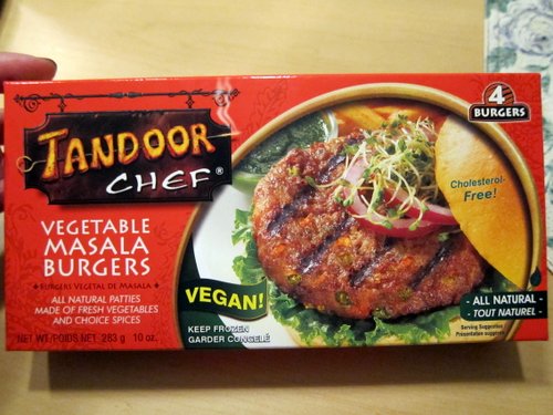 I spotted these Vegetable Masala Burgers by Tandoor Chef at a local grocery store last week and decided to try them. I like veggie burgers, I like Indian food… this seemed like something different that would be perfect for those lazy days.