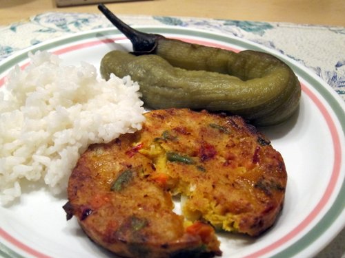 The ingredients include the following: potatoes, canola oil, carrots, green beans, water, bread crumbs, bell peppers, onions, corn, salt, green peppers, milled cane sugar, ginger, cellulose gum, spices, citric acid, tumeric, mustard seeds. They are not gluten-free. I didn’t have any buns (at least not burger buns) so I threw some rice on the plate along with a roasted eggplant.