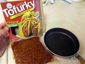 I would say that this is a classic lazy vegan post but it does require some effort, like opening a package and slaving over a hot stove for 5 minutes. I wanted a tasty dinner with minimal effort, so I decided to finally try the Tofurky Chorizo Style product that has been sitting in my fridge. It was perfect because I already had tortillas and only had to stop at the store for some pepperjack Daiya.