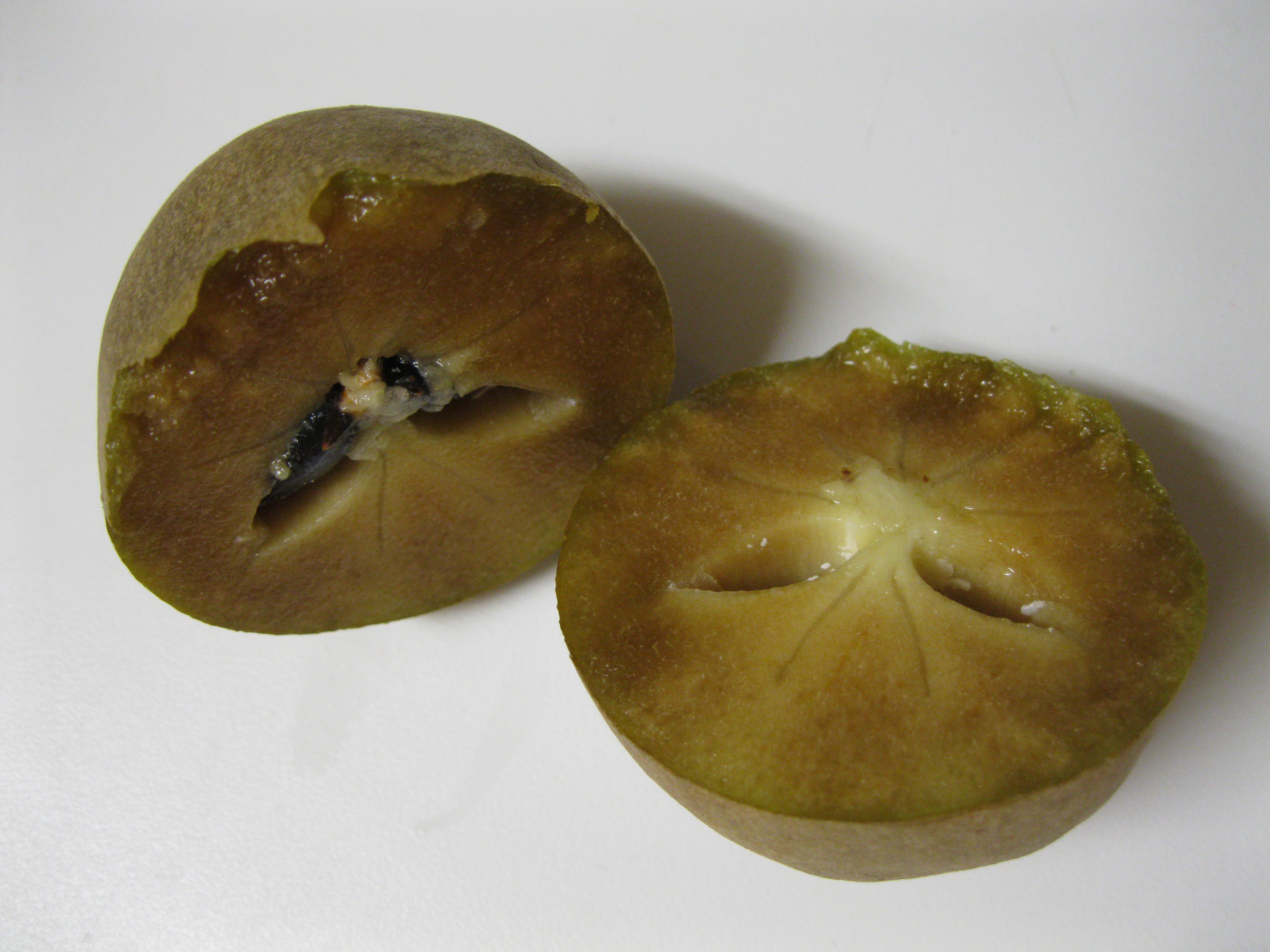 You’ll be able to recognize this fruit by it’s gritty brown skin and its about the size of a Nerf football. They’re ripe when they start to get wrinkly. Cut away the area around the seed and discard the skin. I hope you find one!