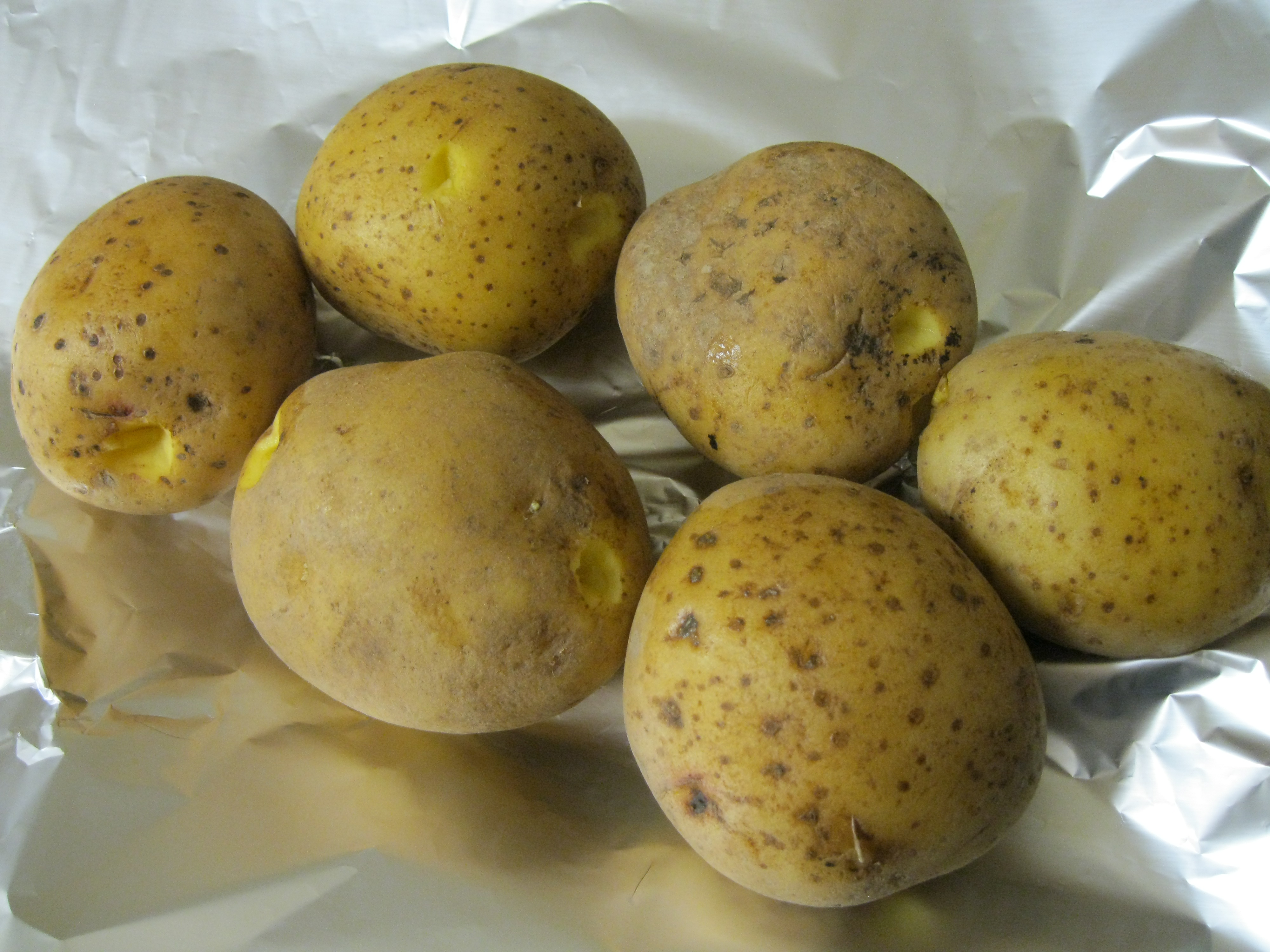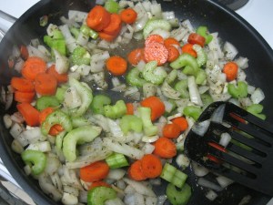 To start Brent washed, cut the eyes out and wrapped 5 fist sized potatoes in tin foil. We used Yukon gold but any sort will do. He put them into the oven to bake for 50 minutes at 400F/200C. While that was happening we cut up the garlic, onion, carrots and celery. Those went into a pan with a little olive oil to saute lightly.