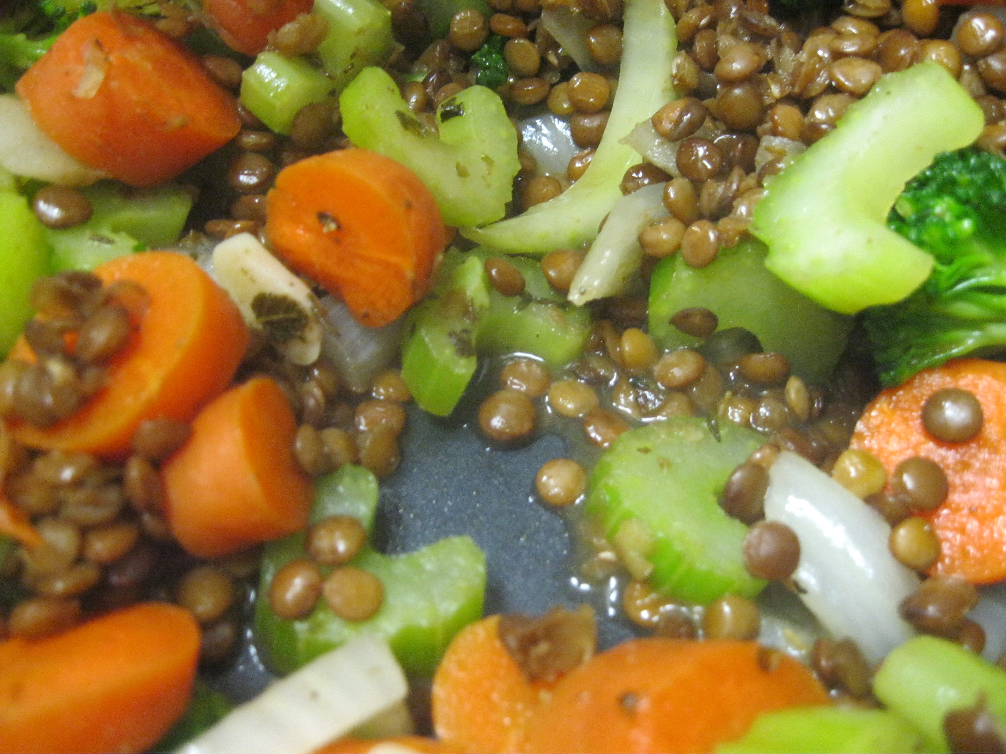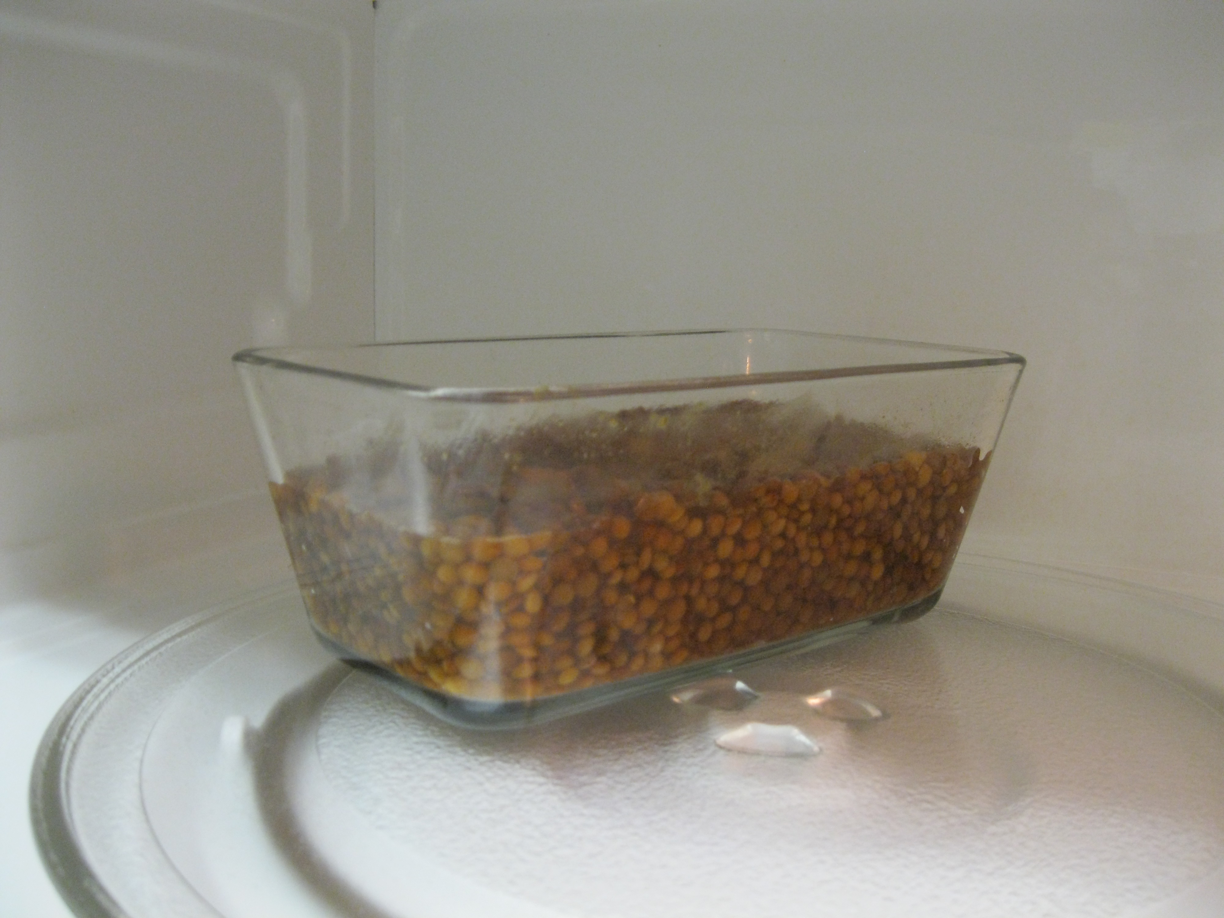 We prepared the lentils in the microwave with 2 cups of water and the veggie bouillon. I like French lentils because they’re smaller and cook faster. They’re also a fabulous color and have a great hearty texture and delicate aromatic flavor. When the lentils are done you’ll want to check on the potatoes.