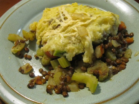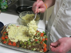 The lentils went into the fry pan with the rest of the veggies, sausage (if you’re using it) and added the spices. The sausage is really for flavor and this dish already has plenty so we’re not using any. I stirred them until they were fragrant, checked the salt and pepper and then dumped them into a large glass baking dish. I smothered them with the mashed potatoes and baked at 350F/275C until the potatoes were brown on top.