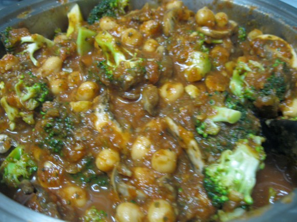Once the sauce tastes like you want it to, stir in the chickpeas. Depending on your vegetables, stir them in so they’ll be tender but not overcooked when you serve them. Alternatively, you can steam or saute them and stir them into the chickpeas and sauce before serving.
