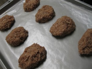 Place rounded teaspoonfuls onto the baking sheet you prepared earlier. I ended up mooshing them into appropriate shapes with my hands and then making an indentation in the middle with the bottom of the spoon.