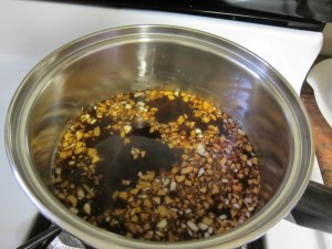 Fire up a pan and brown the soy curls in olive oil — do not add the marinade and set it aside, you’ll need it later! When done, put the soy curls in a bowl. Then, put the onions in the pan and cooking to your liking: I like them to be more on the raw side. Add the marinade to the pan and then remove from heat.